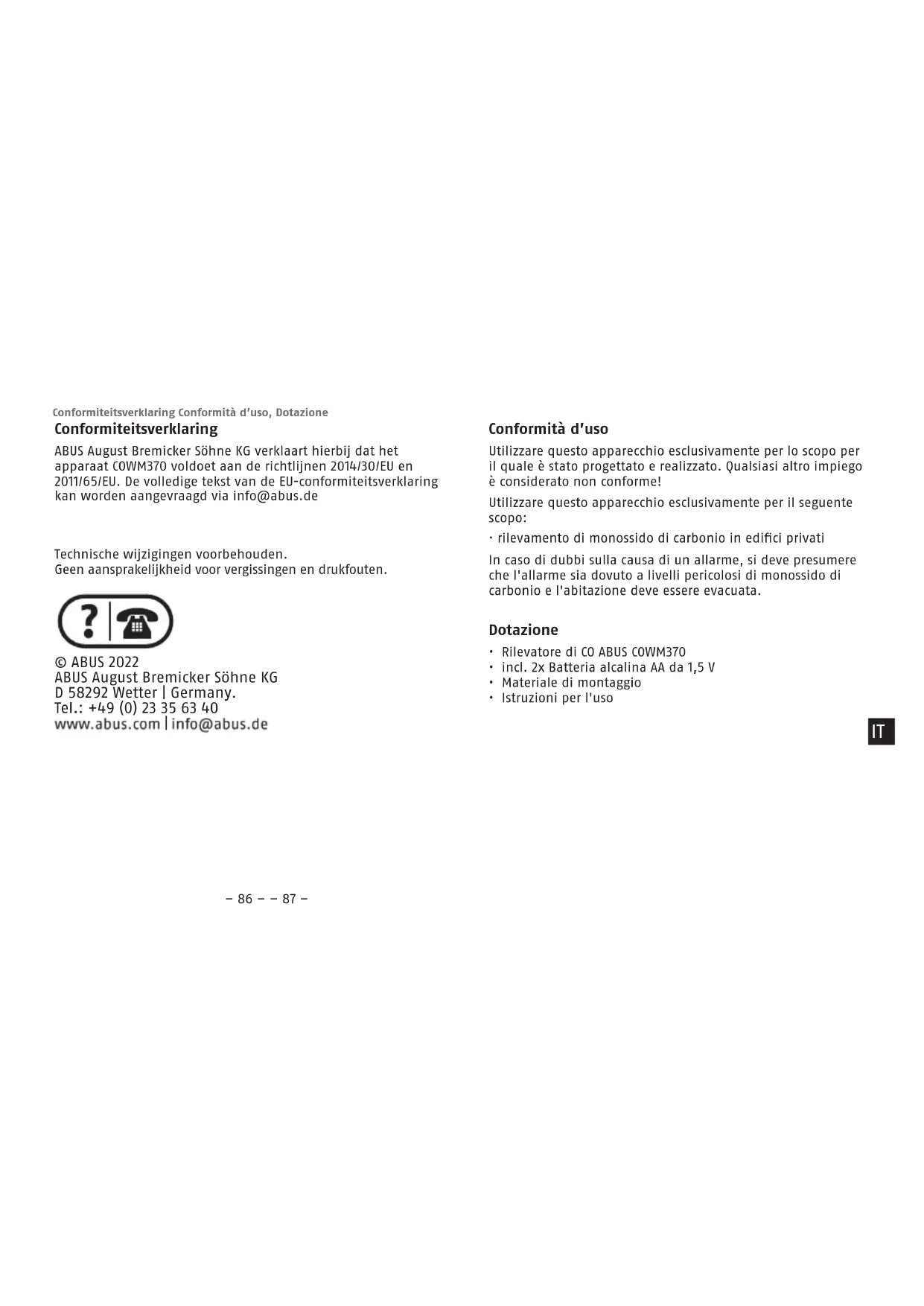 - In caso di difetti al rilevatore di C0 senza li già presenti al momento della vendita, rivolgersi direttamente al venditore entro i primi due anni dall’acquisto. IT– 106 – – 107 – Sostituzione delle batterie, Garanzia Smaltimento Questo prodotto contiene materie prime preziose. Al termine della sua vita utile, smaltire il prodotto secondo le disposizi- oni di legge vigenti. Apparecchi elettrici, batterie ricaricabili e pile non devono essere smaltiti con i riuti domestici. Lo smaltimento deve essere eettuato in conformità alla direttiva 2012/19/UE sui riuti di apparecchiature elettriche ed elettro- niche (RAEE) o alla direttiva 2006/66/CE su pile e accumula- tori, nuovi o esausti. Le batterie devono essere rimosse dagli apparecchi elettrici e smaltite separatamente prima dello smaltimento. Smaltire l’imballaggio dierenziando le sue com- ponenti. Carta e cartone nella carta, pellicole e parti in plastica nella plastica. In caso di domande contattare l‘autorità locale responsabile per lo smaltimento. Le informazioni sui punti di raccolta per i vostri vecchi apparecchi possono essere ottenute, per esempio, dalle amministrazioni comunali o cittadine, dalle aziende locali di smaltimento dei riuti o dal vostro rivenditore specializzato. Dichiarazione di conformità ABUS August Bremicker Söhne KG dichiara che il dispositivo COWM370 è conforme alle direttive 2014/30/UE e 2011/65/UE. Il testo completo della dichiarazione di conformità UE può essere richiesto all’indirizzo e-mail info@abus.de Smaltimento, Conformità WEEE-Reg.-Nr. DE79663011 Ci riserviamo il diritto di apportare modiche tecniche. Per errori e refusi di stampa non ci si assume alcuna responsabilità. © ABUS 2022 ABUS August Bremicker Söhne KG D 58292 Wetter | Germany. Tel.: +49 (0) 23 35 63 40