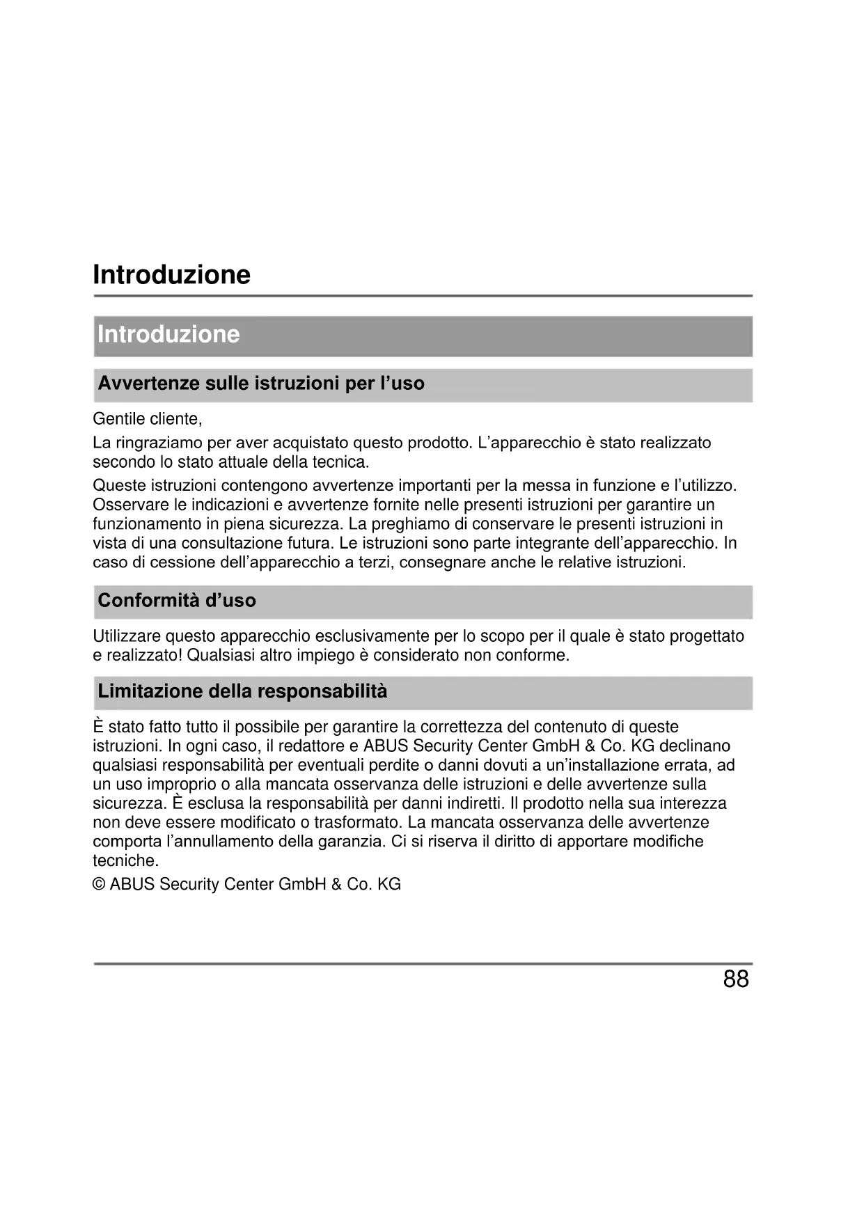Introduzione Avvertenze sulle istruzioni per l’uso Gentile cliente, La ringraziamo per aver acquistato questo prodotto. L’apparecchio è stato realizzato secondo lo stato attuale della tecnica. Queste istruzioni contengono avvertenze importanti per la messa in funzione e l’utilizzo. Osservare le indicazioni e avvertenze fornite nelle presenti istruzioni per garantire un funzionamento in piena sicurezza. La preghiamo di conservare le presenti istruzioni in vista di una consultazione futura. Le istruzioni sono parte integrante dell’apparecchio. In caso di cessione dell’apparecchio a terzi, consegnare anche le relative istruzioni. Conformità d’uso Utilizzare questo apparecchio esclusivamente per lo scopo per il quale è stato progettato e realizzato! Qualsiasi altro impiego è considerato non conforme. Limitazione della responsabilità È stato fatto tutto il possibile per garantire la correttezza del contenuto di queste istruzioni. In ogni caso, il redattore e ABUS Security Center GmbH & Co. KG declinano qualsiasi responsabilità per eventuali perdite o danni dovuti a un’installazione errata, ad un uso improprio o alla mancata osservanza delle istruzioni e delle avvertenze sulla sicurezza. È esclusa la responsabilità per danni indiretti. Il prodotto nella sua interezza non deve essere modificato o trasformato. La mancata osservanza delle avvertenze comporta l’annullamento della garanzia. Ci si riserva il diritto di apportare modifiche tecniche. © ABUS Security Center GmbH & Co. KGAvvertenze di sicurezza