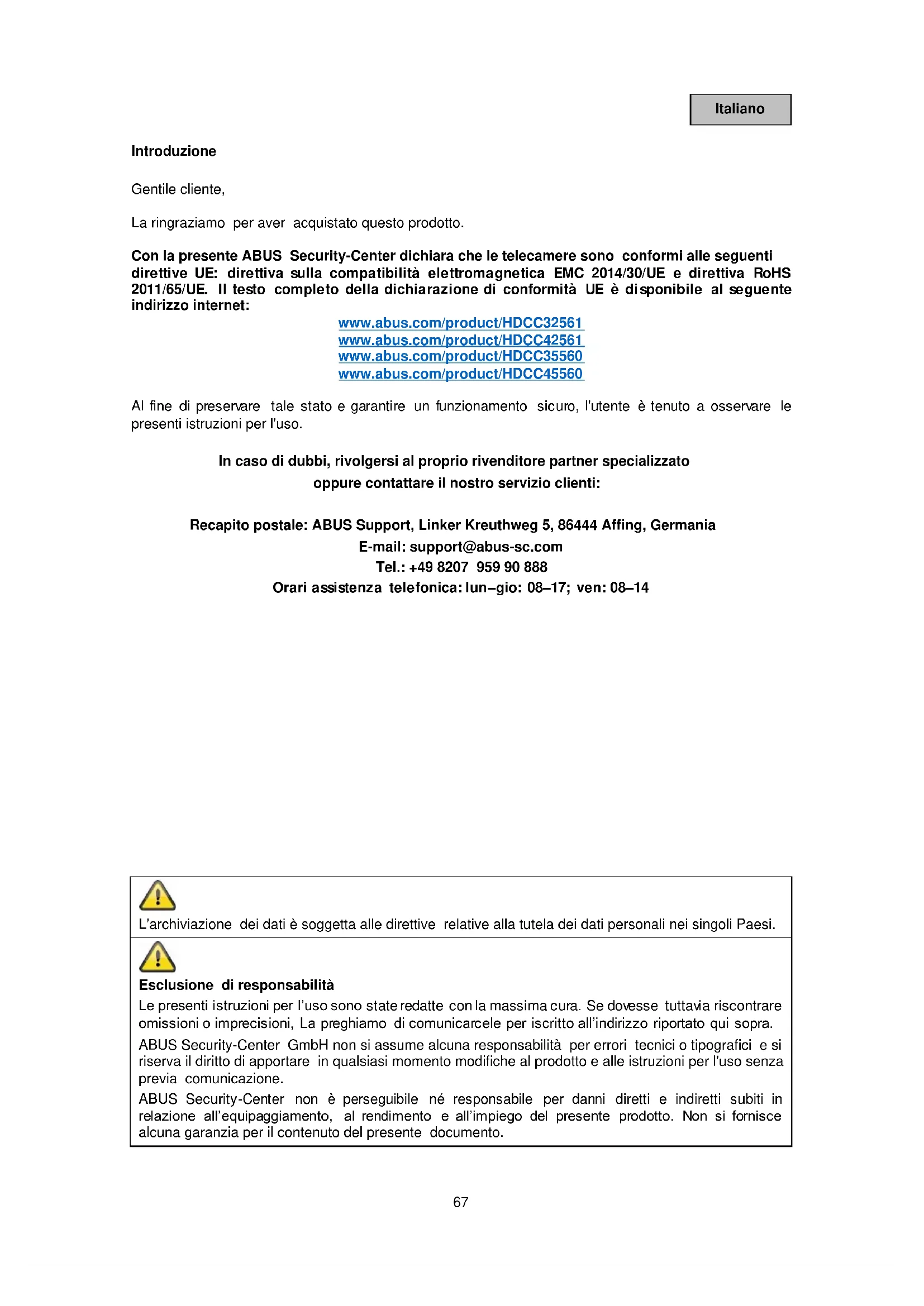 MAIN MENU (Menu principale) Guida al menu generale BACK Torna indietro di un livello nel menu EXIT Esce dal menu principale senza salvare le modifiche EXIT & SAVE Esce dal menu principale e salva tutte le modifiche VIDEO FORMAT Seleziona il formato video HDCC32561 / HDCC42561: o 2 MPx con 25 o 30 immagini al secondo HDCC35560 / HDCC45560: o 2 MPx con 25 o 30 immagini al secondo o 4 MPx con 25 o 30 immagini al secondo o 5 MPx con 20 immagini al secondo78 Italiano EXPOSURE MODE (modalità esposizione) EXPOSURE MODE Imposta il modulo esposizione GLOBAL Automatico BLC Compensazione del controluce HLC Compensazione della luminosità WDR Wide Dynamic Range AGC Controllo automatico del guadagno OFF Spento LOW Basso MIDDLE Medio HIGH Alto SLOW Shutter Tempo di esposizione OFF Tempo di esposizione standard X2 – x16 Tempo di esposizione aumentato Day Night (Impostazioni giorno/notte) MODE Impostazione della modalità AUTO Automatico COLOR L'immagine è sempre a colori BW L'immagine è sempre in bianco e nero IR LIGHT Attivare o disattivare la luce IR SMART IR Impostazione della modalità MODE 1 Sicurezza per ambienti interni/esterni MODE 2 Per gli interni MODE 3 Per gli esterni LEVEL Seleziona il Livello IR D->N THRESHOLD Valore di soglia da giorno a notte Tanto minore è il valore, tanto più tardi cambierà la modalità Giorno/Notte Tanto maggiore è il valore, tanto più tardi cambierà la modalità Giorno/Notte N->D THRESHOLD Valore soglia da giorno a notte (vedere sopra)79 Italiano VIDEO SETTING (Impostazioni video) IMAGE MODE Selezione modalità schermo STD Impostazione standard HIGH-SAT Saturazione elevata WHITE BALANCE Apre le impostazioni bilanciamento del bianco LUMINOSITÀ Imposta la luminosità CONTRASTO Imposta il contrasto SHARPNESS Imposta la nitidezza SATURAZIONE Imposta la saturazione 3DNR Imposta l'eliminazione dinamica dei rumori di fondo MIRROR Capovolge l'immagine telecamera DEFAULT Normale H Orizzontale V Verticale HV Orizzontale e verticale WB (Impostazioni compensazione del bianco) MODE Impostazione della modalità ATW Automatico MANUALE Impostazione manuale RGAIN Imposta la saturazione del rosso BGAIN Imposta la saturazione del blu FUNZIONI (Impostazioni delle funzioni) – Solo per HDCC35560 / HDCC45560 MOTION DET Apre rilevamento del movimento PRIVACY Apre mascheratura delle zone private PRIVACY/MOTION (Mascheratura delle zone private/rilevamento del movimento) MODE Attiva/disattiva mascheratura delle zone private/rilevamento del movimento AREA x Elabora la zona DISPLAY Attiva/disattiva gli avvisi X POSITION Imposta la posizione dell'asse X Y POSITION Imposta la posizione dell'asse Y WIDTH Imposta larghezza HEIGHT Imposta l'altezza RETURN Esce dal menu SENSITIVITY Imposta la sensibilità COLOR Imposta il colore TRANSPARENCY Attiva/disattiva la trasparenza RETURN Voce del menu per uscire FACTORY DEFAULT Imposta la telecamera sulle impostazioni di fabbrica80 Polski Wprowadzenie Szanowna Klientko, Szanowny Kliencie! Dziękujemy za zakup naszego produktu. Firma ABUS Security-Center niniejszym oświadcza, że kamery są zgodne z wymogami następujących dyrektyw UE: Dyrektywy o kompatybilności elektromagnetycznej 2014/30/UE oraz Dyrektywy RoHS 2011/65/UE. Pełny tekst deklaracji zgodności UE jest dostępny na poniższych stronach: www.abus.com/product/HDCC32561 www.abus.com/product/HDCC42561 www.abus.com/product/HDCC35560 www.abus.com/product/HDCC45560 Aby zachować ten stan i zapewnić bezpieczną eksploatację, użytkownik musi przestrzegać niniejszej instrukcji obsługi! W przypadku pytań należy zwracać się do sprzedawcy lub skontaktować się z naszym serwisem: Adres: ABUS Support, Linker Kreuthweg 5, 86444 Affing, Deutschland Adres e-mail: support@abus-sc.com Tel.: +49 8207 959 90 888 Godziny pracy infolinii: pon.–czw.: w godz. 8:00–17:00, piątek: w godz. 8:00–14:00