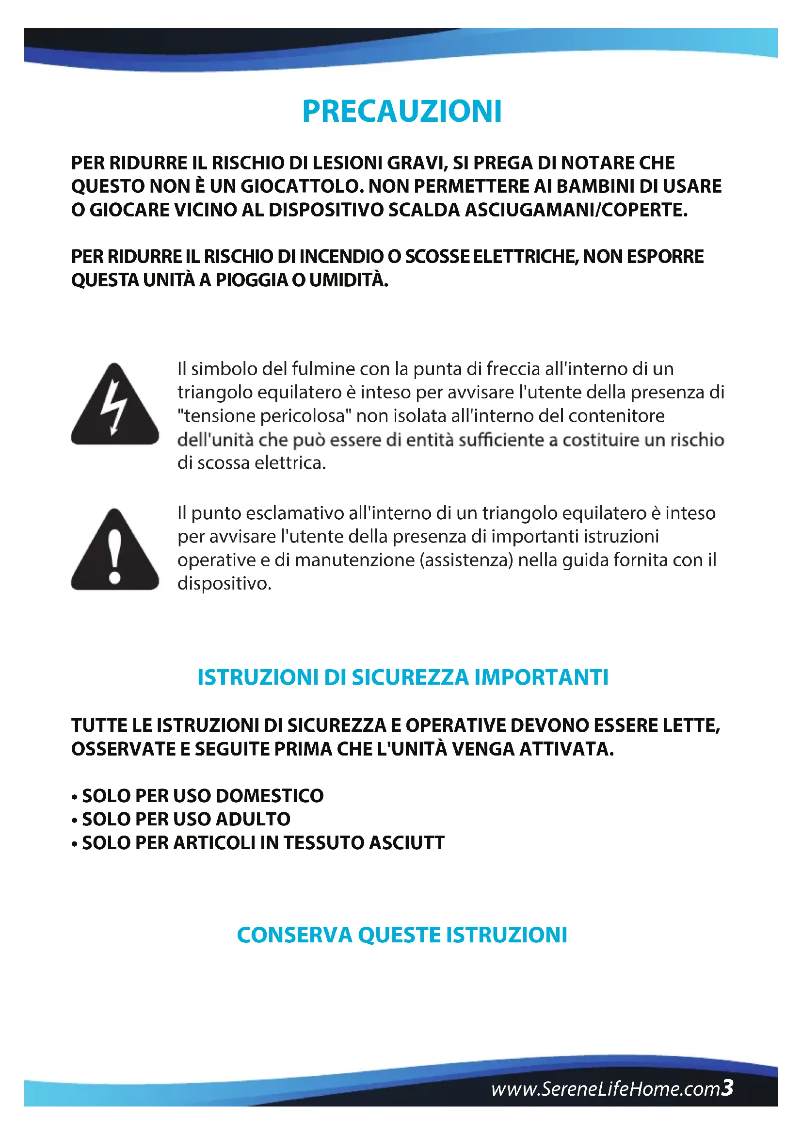 www.SereneLifeHome.com 3 Il simbolo del fulmine con la punta di freccia all'interno di un triangolo equilatero è inteso per avvisare l'utente della presenza di "tensione pericolosa" non isolata all'interno del contenitore di scossa elettrica. Il punto esclamativo all'interno di un triangolo equilatero è inteso per avvisare l'utente della presenza di importanti istruzioni operative e di manutenzione (assistenza) nella guida fornita con il dispositivo.WARNUNG AVVERTENZA: PER RIDURRE IL RISCHIO DI INCENDIO, SCOSSE ELETTRICHE O LESIONI GRAVI A PERSONE DURANTE L'USO DELL'APPARECCHIO, SEGUIRE LE PRECAUZIONI DI BASE, INCLUSE LE SEGUENTI: www.Ser eneLifeHome.com4