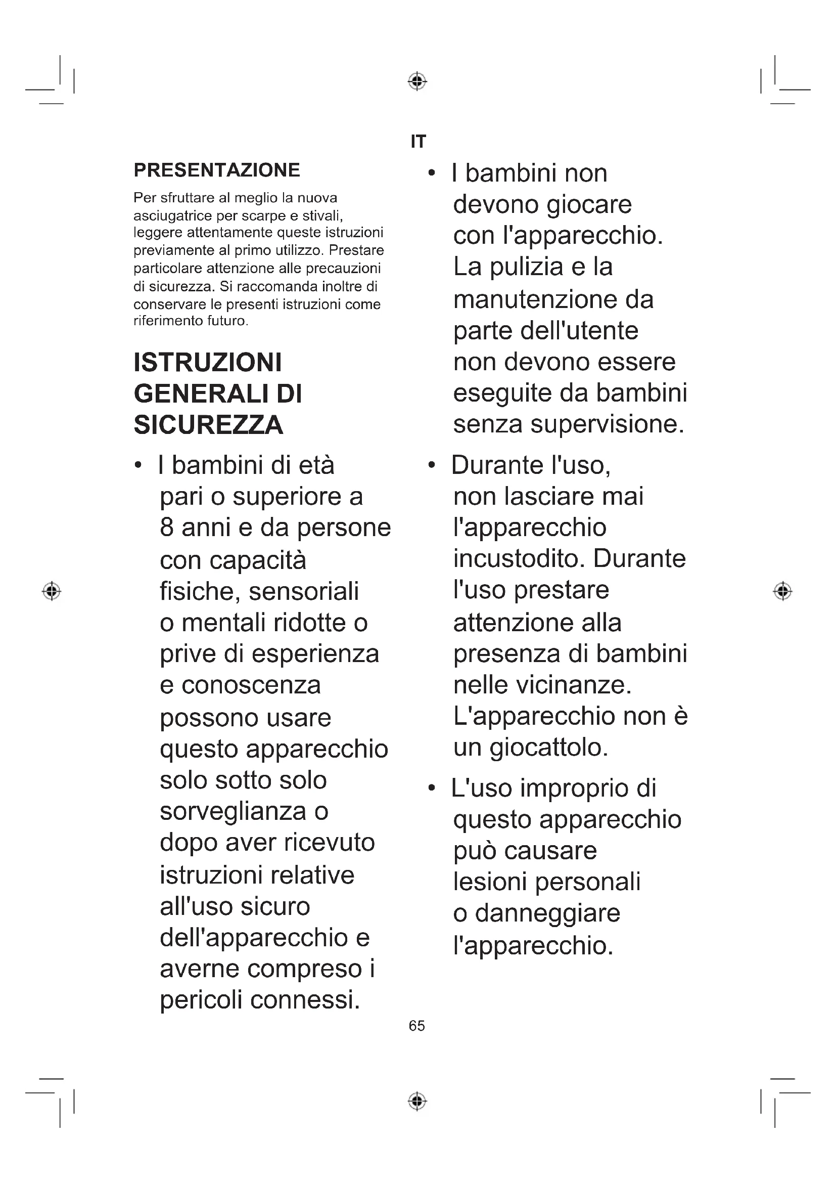 PRESENTAZIONE Per sfruttare al meglio la nuova asciugatrice per scarpe e stivali, leggere attentamente queste istruzioni previamente al primo utilizzo. Prestare particolare attenzione alle precauzioni di sicurezza. Si raccomanda inoltre di conservare le presenti istruzioni come riferimento futuro. ISTRUZIONI GENERALI DI SICUREZZA