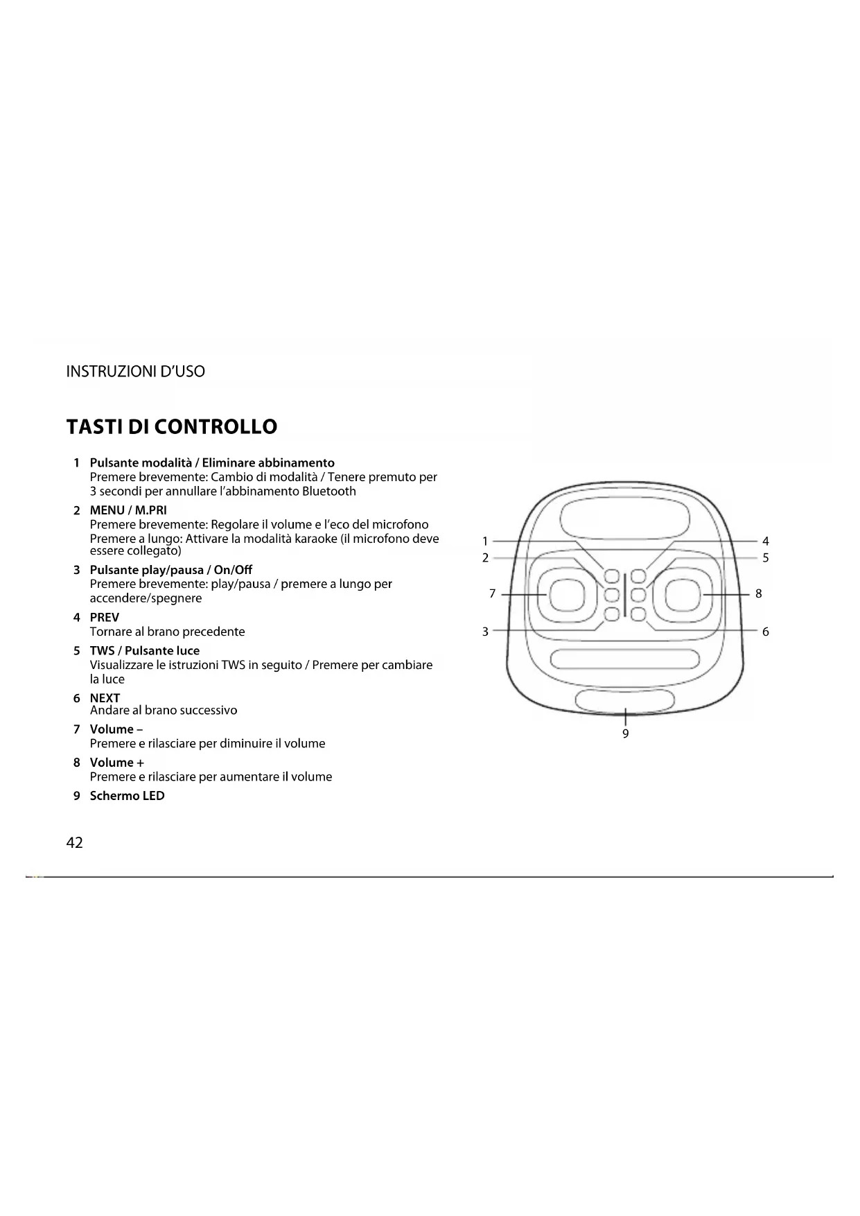 Premere brevemente: Regolare il volume e l’eco del microfono Premere a lungo: Attivare la modalità karaoke (il microfono deve essere collegato) Pulsante play/pausa / On/O Premere brevemente: play/pausa / premere a lungo per accendere/spegnere PREV Tornare al brano precedente TWS / Pulsante luce Visualizzare le istruzioni TWS in seguito / Premere per cambiare la luce NEXT Andare al brano successivo Volume – Premere e rilasciare per diminuire il volume Volume + Premere e rilasciare per aumentare il volume Schermo LED