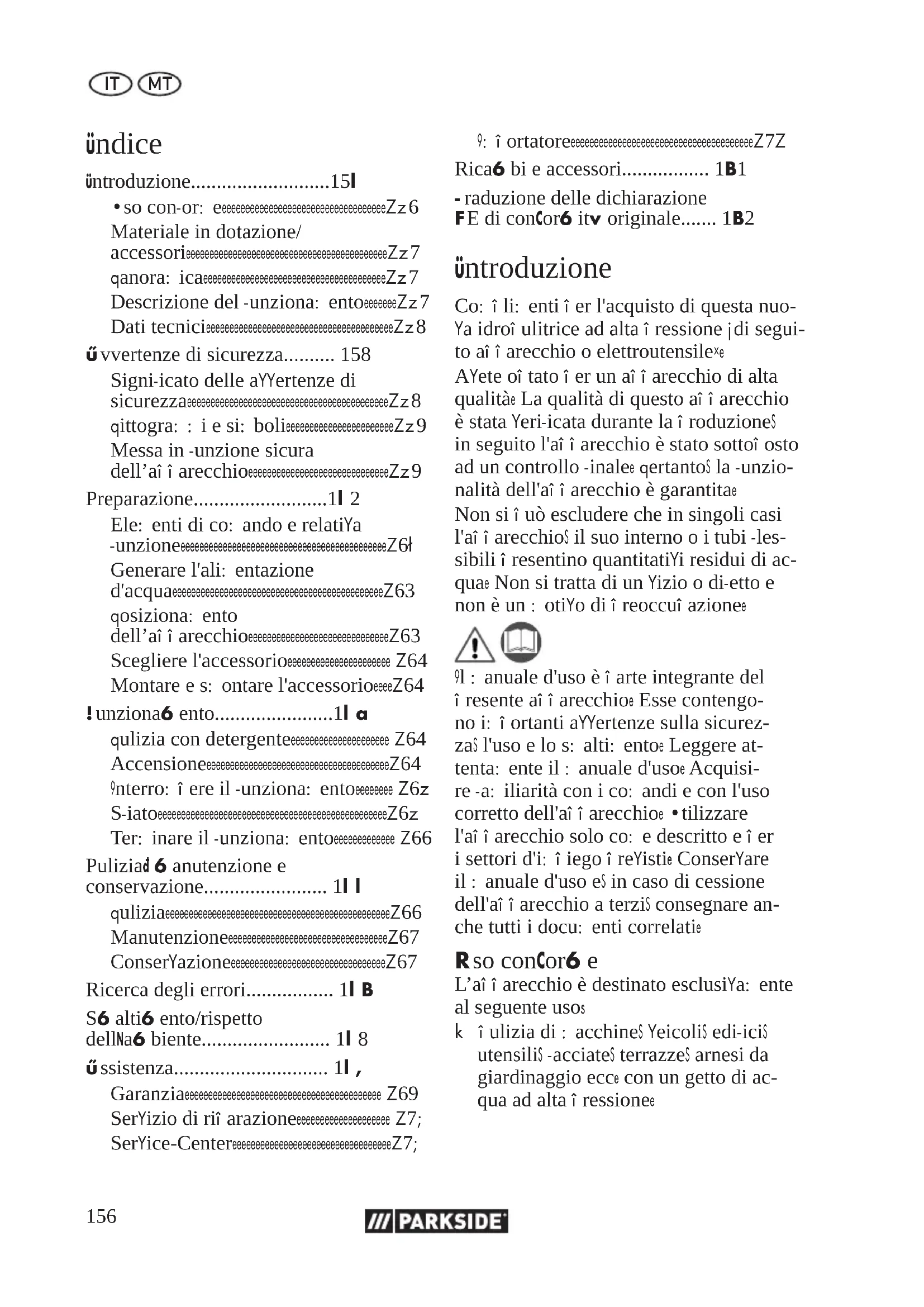 - Traduzione delle dichiarazione CE di conformità originale Introduzione Complimenti per l'acquisto di questa nuo- va idropulitrice ad alta pressione (di segui- to apparecchio o elettroutensile). Avete optato per un apparecchio di alta qualità. La qualità di questo apparecchio è stata verificata durante la produzione, in seguito l'apparecchio è stato sottoposto ad un controllo finale. Pertanto, la funzio- nalità dell'apparecchio è garantita. Non si può escludere che in singoli casi l'apparecchio, il suo interno o i tubi fles- sibili presentino quantitativi residui di ac- qua. Non si tratta di un vizio o difetto e non è un motivo di preoccupazione. Il manuale d'uso è parte integrante del presente apparecchio. Esse contengo- no importanti avvertenze sulla sicurez- za, l'uso e lo smaltimento. Leggere at- tentamente il manuale d'uso. Acquisi- re familiarità con i comandi e con l'uso corretto dell'apparecchio. Utilizzare l'apparecchio solo come descritto e per i settori d'impiego previsti. Conservare il manuale d'uso e, in caso di cessione dell'apparecchio a terzi, consegnare an- che tutti i documenti correlati. Uso conforme L’apparecchio è destinato esclusivamente al seguente uso: p. 172