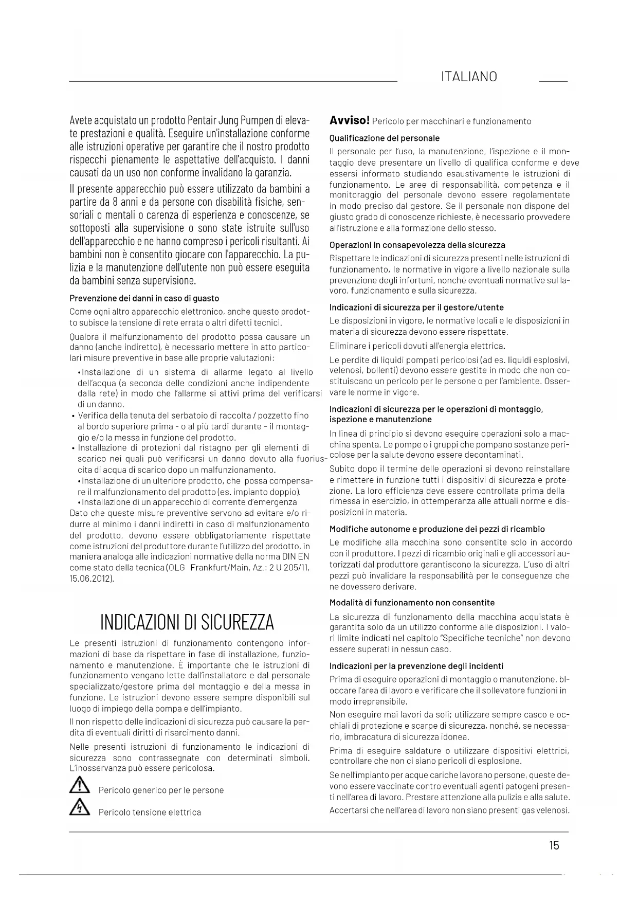Le presenti istruzioni di funzionamento contengono infor- mazioni di base da rispettare in fase di installazione, funzio- namento e manutenzione. È importante che le istruzioni di funzionamento vengano lette dall’installatore e dal personale specializzato/gestore prima del montaggio e della messa in funzione. Le istruzioni devono essere sempre disponibili sul luogo di impiego della pompa e dell’impianto. Il non rispetto delle indicazioni di sicurezza può causare la per- dita di eventuali diritti di risarcimento danni. Nelle presenti istruzioni di funzionamento le indicazioni di sicurezza sono contrassegnate con determinati simboli. L’inosservanza può essere pericolosa. Pericolo generico per le persone Pericolo tensione elettrica Avviso! Pericolo per macchinari e funzionamento Qualicazione del personale Il personale per l’uso, la manutenzione, l’ispezione e il mon- taggio deve presentare un livello di qualica conforme e deve essersi informato studiando esaustivamente le istruzioni di funzionamento. Le aree di responsabilità, competenza e il monitoraggio del personale devono essere regolamentate in modo preciso dal gestore. Se il personale non dispone del giusto grado di conoscenze richieste, è necessario provvedere all’istruzione e alla formazione dello stesso. Operazioni in consapevolezza della sicurezza Rispettare le indicazioni di sicurezza presenti nelle istruzioni di funzionamento, le normative in vigore a livello nazionale sulla prevenzione degli infortuni, nonché eventuali normative sul la- voro, funzionamento e sulla sicurezza. Indicazioni di sicurezza per il gestore/utente Le disposizioni in vigore, le normative locali e le disposizioni in materia di sicurezza devono essere rispettate. Eliminare i pericoli dovuti all’energia elettrica. Le perdite di liquidi pompati pericolosi (ad es. liquidi esplosivi, velenosi, bollenti) devono essere gestite in modo che non co- stituiscano un pericolo per le persone o per l’ambiente. Osser- vare le norme in vigore. Indicazioni di sicurezza per le operazioni di montaggio, ispezione e manutenzione In linea di principio si devono eseguire operazioni solo a mac- china spenta. Le pompe o i gruppi che pompano sostanze peri- colose per la salute devono essere decontaminati. Subito dopo il termine delle operazioni si devono reinstallare e rimettere in funzione tutti i dispositivi di sicurezza e prote- zione. La loro ecienza deve essere controllata prima della rimessa in esercizio, in ottemperanza alle attuali norme e dis- posizioni in materia. Modiche autonome e produzione dei pezzi di ricambio Le modiche alla macchina sono consentite solo in accordo con il produttore. I pezzi di ricambio originali e gli accessori au- torizzati dal produttore garantiscono la sicurezza. L’uso di altri pezzi può invalidare la responsabilità per le conseguenze che ne dovessero derivare. Modalità di funzionamento non consentite La sicurezza di funzionamento della macchina acquistata è garantita solo da un utilizzo conforme alle disposizioni. I valo- ri limite indicati nel capitolo “Speciche tecniche” non devono essere superati in nessun caso. Indicazioni per la prevenzione degli incidenti Prima di eseguire operazioni di montaggio o manutenzione, bl- occare l’area di lavoro e vericare che il sollevatore funzioni in modo irreprensibile. Non eseguire mai lavori da soli; utilizzare sempre casco e oc- chiali di protezione e scarpe di sicurezza, nonché, se necessa- rio, imbracatura di sicurezza idonea. Prima di eseguire saldature o utilizzare dispositivi elettrici, controllare che non ci siano pericoli di esplosione. Se nell’impianto per acque cariche lavorano persone, queste de- vono essere vaccinate contro eventuali agenti patogeni presen- ti nell’area di lavoro. Prestare attenzione alla pulizia e alla salute. Accertarsi che nell’area di lavoro non siano presenti gas velenosi.16 ITALIANO Osservare le normative sulla sicurezza del lavoro e tenere a disposizione il kit di primo soccorso. In alcuni casi la pompa e il mezzo potrebbero essere incande- scenti, pericolo di ustioni. Per il montaggio in aree a rischio di esplosione sono valide speciche normative. IMPIEGO AVVERTENZA! Accertarsi di collegare la pompa soltanto a prese installate secondo normativa, rese sicure con un fusibile ritardato da al- meno 10 A e con un interruttore differenziale ad alta sensibilità (30mA). PERICOLO! La pompa non può essere utilizzata se nell’acqua è presente una persona Le motopompe sommergibili della serie UV 3 sono adatte per il pompaggio di acque reue domestiche senza pietre. Questo include anche l'acqua sporca delle lavatrici e delle lavastoviglie domestiche. AVVISO! All’aperto si devono utilizzare solo pompe con un cavo di alimentazione di almeno 10 m. Quando si usa una pompa, si impone il rispetto delle rispettive leggi e disposizioni nazionali così come dei regolamenti locali in materia, quali ad es.