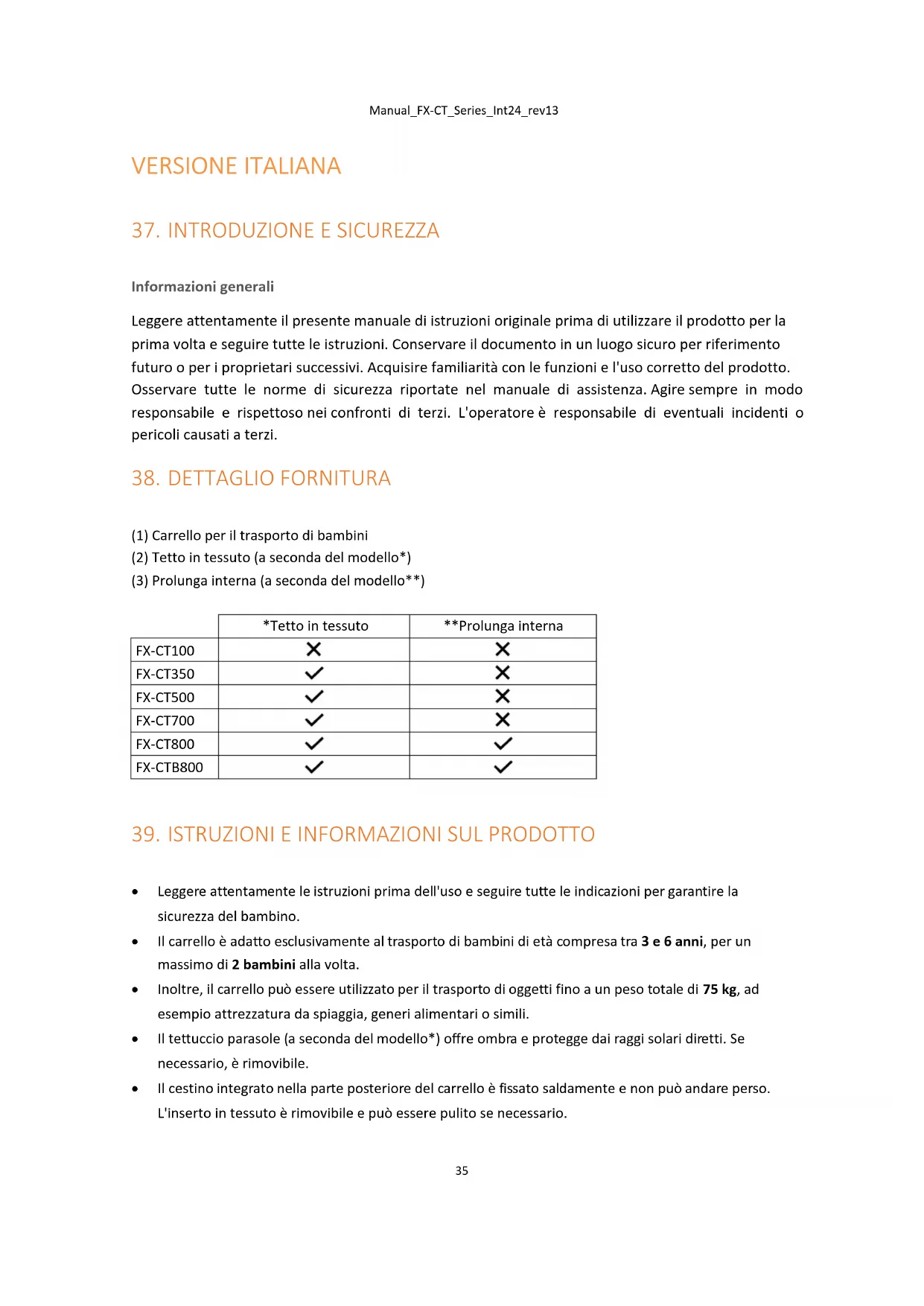 - Prima di ogni utilizzo, assicurarsi che le ruote e gli assi siano ben fissati e non presentino danni.Manual_FX-CT_Series_Int24_rev13