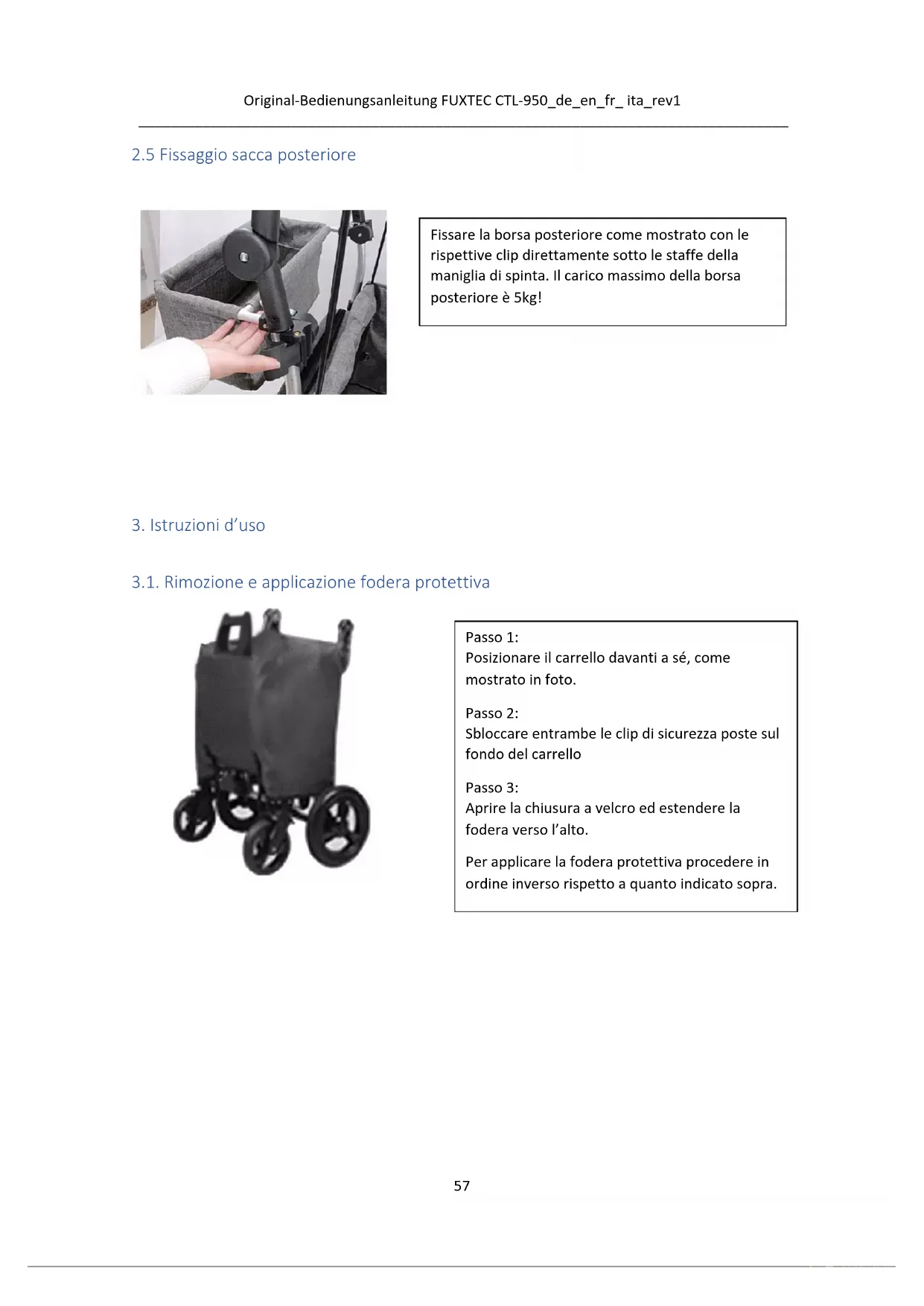 Si raccomanda di controllare e pulire regolarmente il prodotto. – Controllare regolarmente tutte le parti importanti per verificare la presenza di danni. Accertarsi che le parti meccaniche funzionino in maniera ottimale. – Controllare regolarmente che tutte le viti, i rivetti, i bulloni e altre parti di serraggio siano fissate saldamente. – Non utilizzare per la lubrificazione grasso o olio, bensì uno spray a base di silicone. – Un carico eccessivo, la chiusura non corretta o l’utilizzo di accessori non consentiti possono danneggiare il carrello o comprometterne l’integrità. – Non inserire mai più di 5 kg di articoli nella sacca posteriore. – Conservare il carrello ripiegato esclusivamente in un luogo ben areato per evitare la formazione di muffa. – In caso di intenso utilizzo in un arco di tempo prolungato, in cui vi è ad esempio un’intensa esposizione ai raggi solari, i tessuti possono scolorirsi; ciò non può rappresentare motivo di reclamo. – Non utilizzare il carrello se vi sono parti piegate, logore o rotte. – Non utilizzare sul carrello CTL 900 accessori non autorizzati da FUXTEC GmbH. Passo 2: Aprire tutte le chiusure a velcro e i bottoni posti sul lato anteriore e posteriore del carrello. Passo 3: Aprire tutte le chiusure a velcro poste sul lato inferiore del carrello. Al termine di questa operazione, è possibile sfilare il rivestimento in stoffa dal telaio.Original-Bedienungsanleitung FUXTEC CTL-950_de_en_fr_ ita_rev1