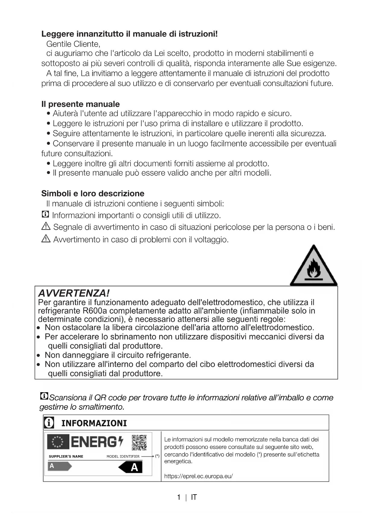 - CScansiona il QR code per trovare tutte le informazioni relative all’imballo e come gestirne lo smaltimento. 1 | ITINDICE 1 Il frigorifero 3 2 Importanti avvertenze per la sicurezza 4 Uso previsto p. 4