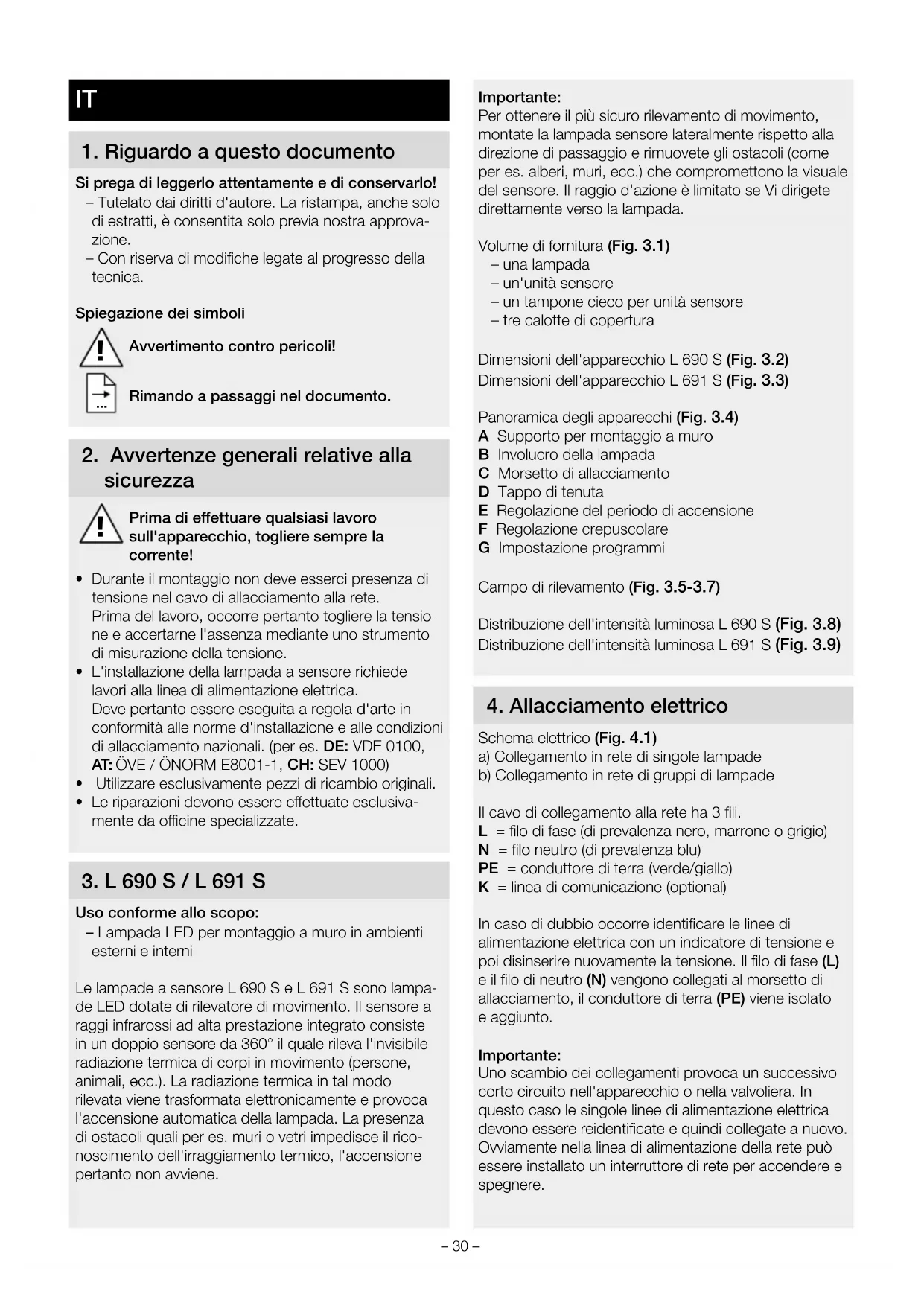Uso conforme allo scopo: – Lampada LED per montaggio a muro in ambienti esterni e interni Le lampade a sensore L690 S e L691 S sono lampa- de LED dotate di rilevatore di movimento. Il sensore a raggi infrarossi ad alta prestazione integrato consiste in un doppio sensore da 360° il quale rileva l'invisibile radiazione termica di corpi in movimento (persone, animali, ecc.). La radiazione termica in tal modo rilevata viene trasformata elettronicamente e provoca l'accensione automatica della lampada. La presenza di ostacoli quali per es. muri o vetri impedisce il rico- noscimento dell'irraggiamento termico, l'accensione pertanto non avviene. Importante: Per ottenere il più sicuro rilevamento di movimento, montate la lampada sensore lateralmente rispetto alla direzione di passaggio e rimuovete gli ostacoli (come per es. alberi, muri, ecc.) che compromettono la visuale del sensore. Il raggio d'azione è limitato se Vi dirigete direttamente verso la lampada. Volume di fornitura (Fig.3.1) – una lampada – un'unità sensore – un tampone cieco per unità sensore – tre calotte di copertura Dimensioni dell'apparecchio L690 S (Fig.3.2) Dimensioni dell'apparecchio L691 S (Fig.3.3) Panoramica degli apparecchi (Fig.3.4) A Supporto per montaggio a muro B Involucro della lampada C Morsetto di allacciamento D Tappo di tenuta E Regolazione del periodo di accensione F Regolazione crepuscolare G Impostazione programmi Campo di rilevamento (Fig.3.5-3.7) Distribuzione dell'intensità luminosa L690S (Fig.3.8) Distribuzione dell'intensità luminosa L691S (Fig.3.9)