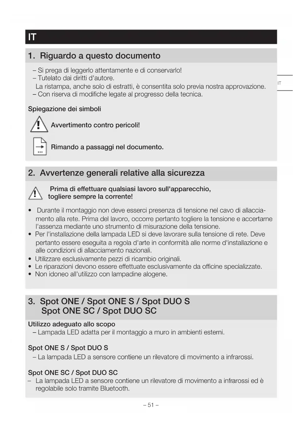 Spot ONESC / Spot DUO SC Utilizzo adeguato allo scopo – Lampada LED adatta per il montaggio a muro in ambienti esterni. Spot ONES / Spot DUOS – La lampada LED a sensore contiene un rilevatore di movimento a infrarossi. Spot ONESC / Spot DUOSC – La lampada LED a sensore contiene un rilevatore di movimento a infrarossi ed è regolabile solo tramite Bluetooth. IT– 52 – Utilizzo non adeguato allo scopo – La lampada non è dimmerabile. Non dimmeriz- zabile Volume di fornitura Spot ONE (Fig. 3.1) – Lampada – Tre viti – Tre tasselli – Tre distanziatori Volume di fornitura Spot DUO (Fig. 3.2) – Lampada – Quattro viti – Quattro tasselli – Quattro distanziatori Dimensioni del prodotto Spot ONE (Fig. 3.3) Spot DUO (Fig. 3.4) Panoramica del prodotto (Fig. 3.5) A Supporto per montaggio a muro B Morsetto di allacciamento C Vite di sicurezza D Base della lampada E Alloggiamento della lampada F Regolazione crepuscolare (Solo Spot ONES / DUOS) G Regolazione del periodo di accensione (Solo Spot ONES / DUOS) Campo di rilevamento Spot ONES / DUOS (Fig. 3.6 – 3.8) Distribuzione dell'intensità luminosa (Fig. 3.9)
