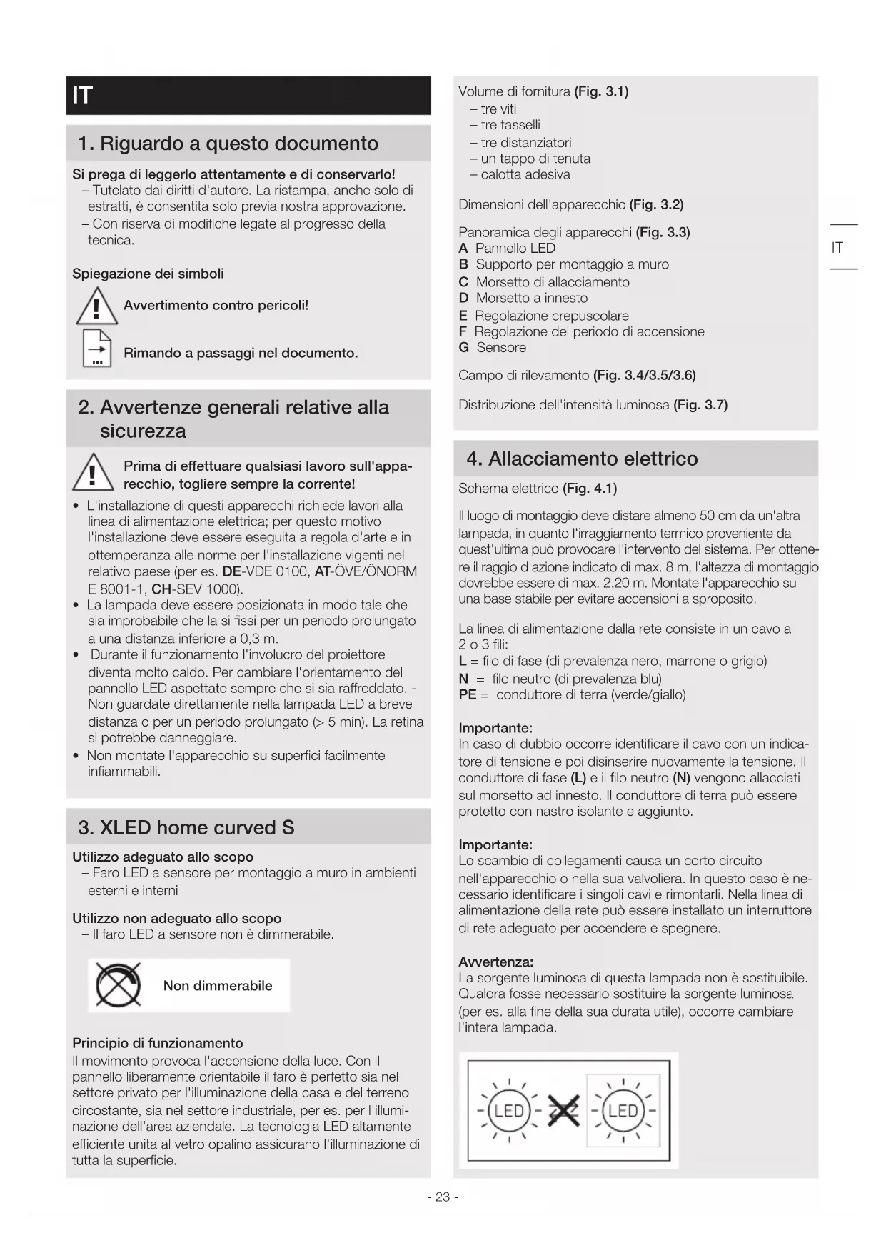 Avvertimento contro pericoli! Rimando a passaggi nel documento 2 Avvertenze generali relative alla sicurezza Prima di eettuare qualsiasi lavoro sull'appa-recchio, togliere sempre la corrente! • L'installazione di questi apparecchi richiede lavori alla linea di alimentazione elettrica; per questo motivo l'installazione deve essere eseguita a regola d'arte e in ottemperanza alle norme per l'installazione vigenti nel relativo paese (per es. DE-VDE 0100, AT-ÖVE/ÖNORM E 8001-1, CH-SEV 1000).• La lampada deve essere posizionata in modo tale che sia improbabile che la si fissi per un periodo prolungato a una distanza inferiore a 0,3 m.• Durante il funzionamento l'involucro del proiettore diventa molto caldo. Per cambiare l'orientamento del pannello LED aspettate sempre che si sia rareddato. - Non guardate direttamente nella lampada LED a breve distanza o per un periodo prolungato (> 5 min). La retina si potrebbe danneggiare.• Non montate l'apparecchio su superfici facilmente infiammabili. 3 XLED home curved S Utilizzo adeguato allo scopo – Faro LED a sensore per montaggio a muro in ambienti esterni e interniUtilizzo non adeguato allo scopo – Il faro LED a sensore non è dimmerabile.Non dimmerabilePrincipio di funzionamentoIl movimento provoca l'accensione della luce. Con il pannello liberamente orientabile il faro è perfetto sia nel settore privato per l'illuminazione della casa e del terreno circostante, sia nel settore industriale, per es. per l'illumi-nazione dell'area aziendale. La tecnologia LED altamente eciente unita al vetro opalino assicurano l'illuminazione di tutta la superficie.