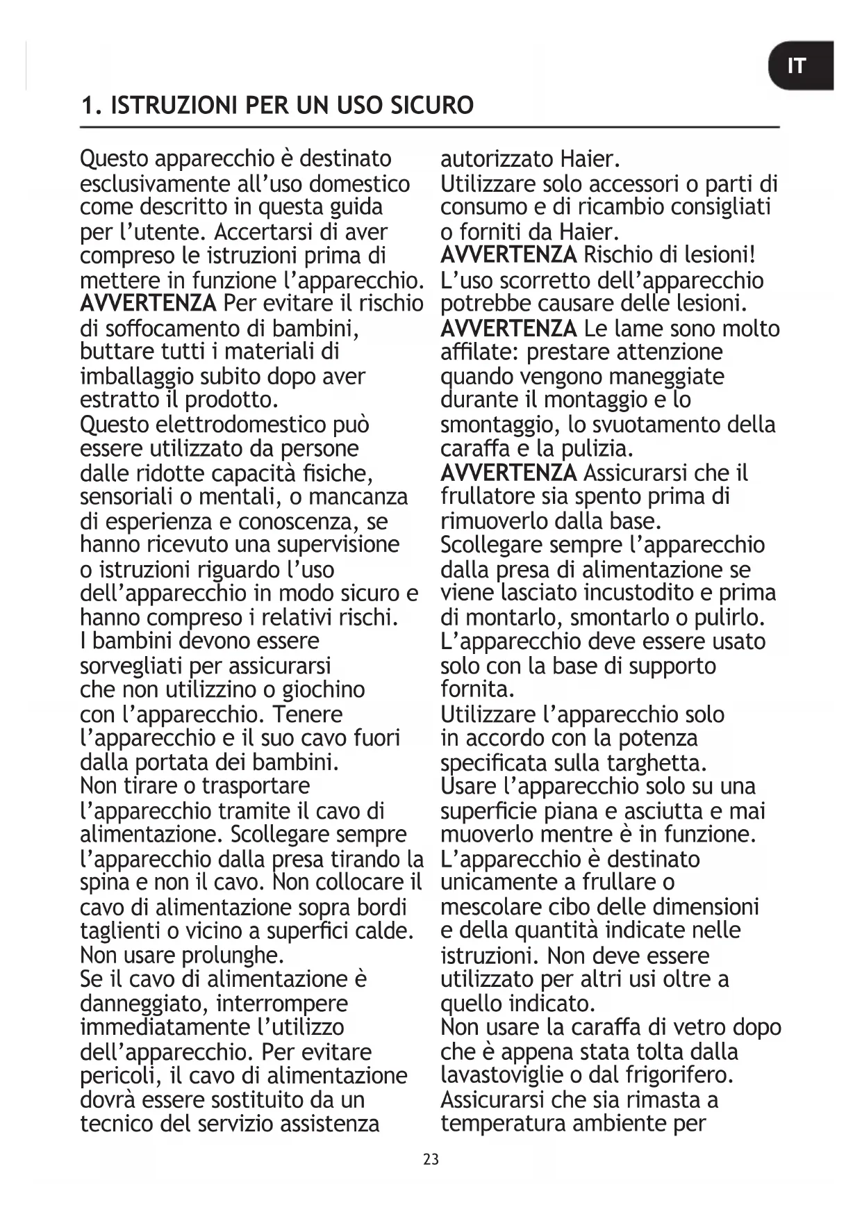 DE23 Questo apparecchio è destinato esclusivamente all’uso domestico come descritto in questa guida per l’utente. Accertarsi di aver compreso le istruzioni prima di mettere in funzione l’apparecchio. AVVERTENZA Per evitare il rischio di soocamento di bambini, buttare tutti i materiali di imballaggio subito dopo aver estratto il prodotto. Questo elettrodomestico può essere utilizzato da persone dalle ridotte capacità siche, sensoriali o mentali, o mancanza di esperienza e conoscenza, se hanno ricevuto una supervisione o istruzioni riguardo l’uso dell’apparecchio in modo sicuro e hanno compreso i relativi rischi. I bambini devono essere sorvegliati per assicurarsi che non utilizzino o giochino con l’apparecchio. Tenere l’apparecchio e il suo cavo fuori dalla portata dei bambini. Non tirare o trasportare l’apparecchio tramite il cavo di alimentazione. Scollegare sempre l’apparecchio dalla presa tirando la spina e non il cavo. Non collocare il cavo di alimentazione sopra bordi taglienti o vicino a superci calde. Non usare prolunghe. Se il cavo di alimentazione è danneggiato, interrompere immediatamente l’utilizzo dell’apparecchio. Per evitare pericoli, il cavo di alimentazione dovrà essere sostituito da un tecnico del servizio assistenza autorizzato Haier. Utilizzare solo accessori o parti di consumo e di ricambio consigliati o forniti da Haier. AVVERTENZA Rischio di lesioni! L’uso scorretto dell’apparecchio potrebbe causare delle lesioni. AVVERTENZA Le lame sono molto alate: prestare attenzione quando vengono maneggiate durante il montaggio e lo smontaggio, lo svuotamento della caraa e la pulizia. AVVERTENZA Assicurarsi che il frullatore sia spento prima di rimuoverlo dalla base. Scollegare sempre l’apparecchio dalla presa di alimentazione se viene lasciato incustodito e prima di montarlo, smontarlo o pulirlo. L’apparecchio deve essere usato solo con la base di supporto fornita. Utilizzare l’apparecchio solo in accordo con la potenza specicata sulla targhetta. Usare l’apparecchio solo su una supercie piana e asciutta e mai muoverlo mentre è in funzione. L’apparecchio è destinato unicamente a frullare o mescolare cibo delle dimensioni e della quantità indicate nelle istruzioni. Non deve essere utilizzato per altri usi oltre a quello indicato. Non usare la caraa di vetro dopo che è appena stata tolta dalla lavastoviglie o dal frigorifero. Assicurarsi che sia rimasta a temperatura ambiente per