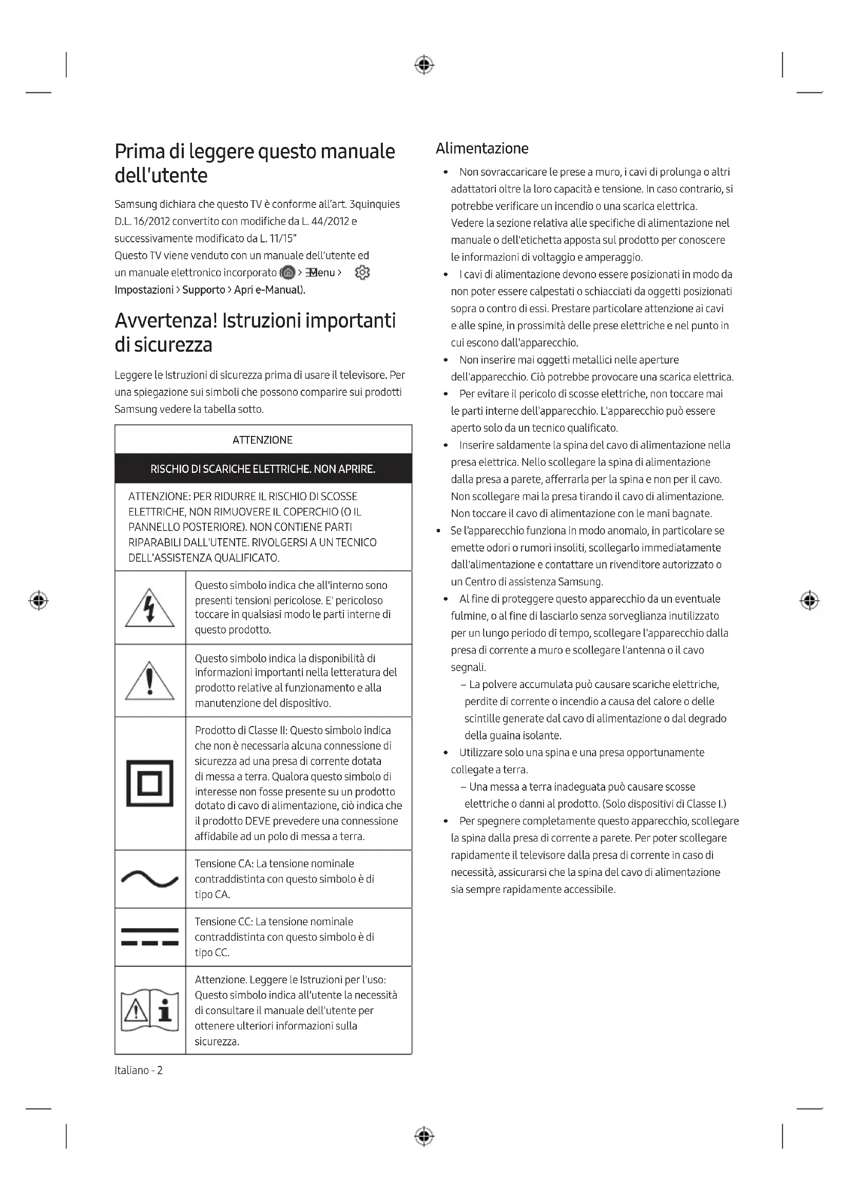 DELL'ASSISTENZA QUALIFICATO. Questo simbolo indica che all'interno sono presenti tensioni pericolose. E' pericoloso toccare in qualsiasi modo le parti interne di questo prodotto. Questo simbolo indica la disponibilità di informazioni importanti nella letteratura del prodotto relative al funzionamento e alla manutenzione del dispositivo. Prodotto di Classe II: Questo simbolo indica che non è necessaria alcuna connessione di sicurezza ad una presa di corrente dotata di messa a terra. Qualora questo simbolo di interesse non fosse presente su un prodotto dotato di cavo di alimentazione, ciò indica che il prodotto DEVE prevedere una connessione affidabile ad un polo di messa a terra. Tensione CA: La tensione nominale contraddistinta con questo simbolo è di tipo CA. Tensione CC: La tensione nominale contraddistinta con questo simbolo è di tipo CC. Attenzione. Leggere le Istruzioni per l'uso: Questo simbolo indica all'utente la necessità di consultare il manuale dell'utente per ottenere ulteriori informazioni sulla sicurezza. Alimentazione