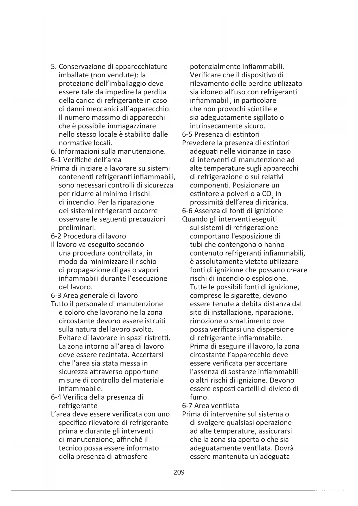 6-1 Veriche dell’area Prima di iniziare a lavorare su sistemi contenen refrigeran inammabili, sono necessari controlli di sicurezza per ridurre al minimo i rischi di incendio. Per la riparazione dei sistemi refrigeran occorre osservare le seguen precauzioni preliminari. 6-2 Procedura di lavoro Il lavoro va eseguito secondo una procedura controllata, in modo da minimizzare il rischio di propagazione di gas o vapori inammabili durante l’esecuzione del lavoro. 6-3 Area generale di lavoro Tuo il personale di manutenzione e coloro che lavorano nella zona circostante devono essere istrui sulla natura del lavoro svolto. Evitare di lavorare in spazi ristre. La zona intorno all’area di lavoro deve essere recintata. Accertarsi che l'area sia stata messa in sicurezza araverso opportune misure di controllo del materiale inammabile. 6-4 Verica della presenza di refrigerante L’area deve essere vericata con uno specico rilevatore di refrigerante prima e durante gli interven di manutenzione, anché il tecnico possa essere informato della presenza di atmosfere potenzialmente inammabili. Vericare che il disposivo di rilevamento delle perdite ulizzato sia idoneo all’uso con refrigeran inammabili, in parcolare che non provochi scinlle e sia adeguatamente sigillato o intrinsecamente sicuro. 6-5 Presenza di esntori Prevedere la presenza di esntori adegua nelle vicinanze in caso di interven di manutenzione ad alte temperature sugli apparecchi di refrigerazione o sui relavi componen. Posizionare un esntore a polveri o a CO