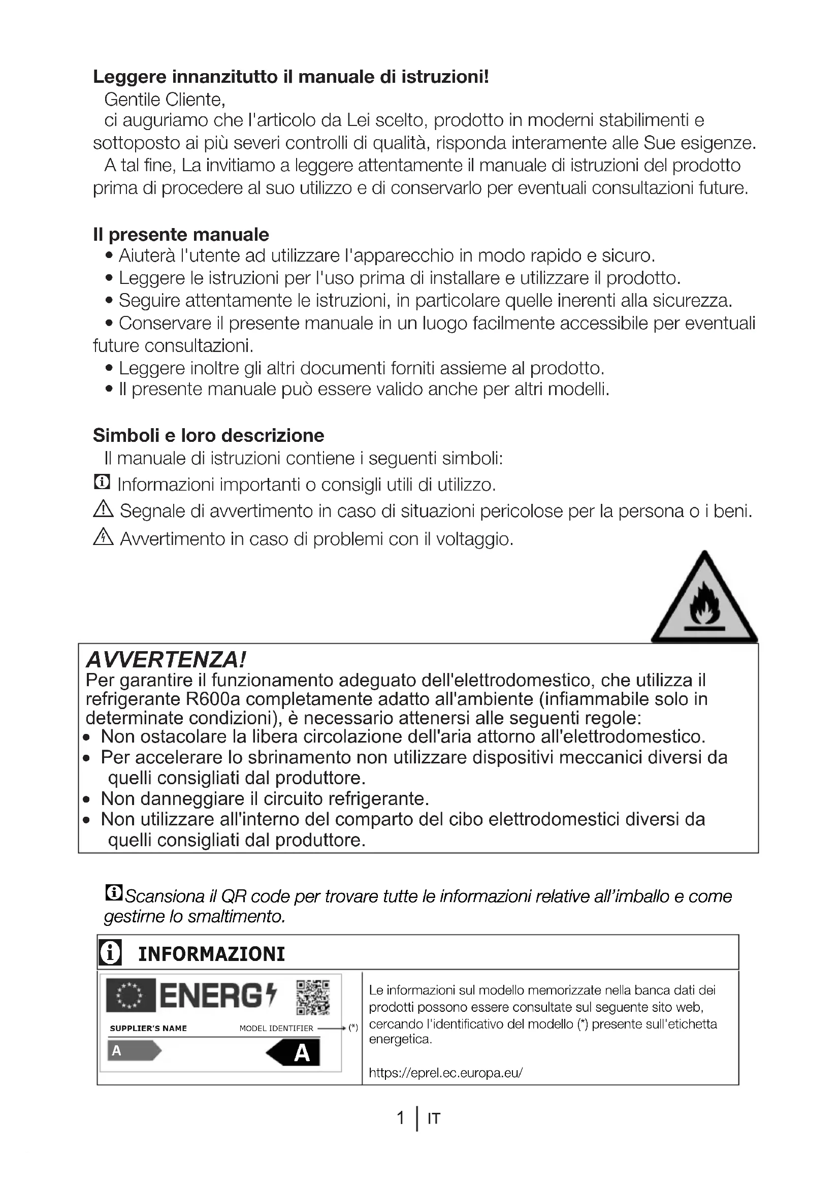 - Die Lebensmittel berühren eventuell den oberen T eil der Schublade. Ordnen Sie die Lebensmittel in der Schublade anders an.Leggere innanzitutto il manuale di istruzioni Gentile Cliente,ci auguriamo che l'articolo da Lei scelto, prodotto in moderni stabilimenti e sottoposto ai più severi controlli di qualità, risponda interamente alle Sue esigenze. A tal fine, La invitiamo a leggere attentamente il manuale di istruzioni del prodotto prima di procedere al suo utilizzo e di conservarlo per eventuali consultazioni future.Il presente manuale• Aiuterà l'utente ad utilizzare l'apparecchio in modo rapido e sicuro.• Leggere le istruzioni per l'uso prima di installare e utilizzare il prodotto.• Seguire attentamente le istruzioni, in particolare quelle inerenti alla sicurezza.• Conservare il presente manuale in un luogo facilmente accessibile per eventualifuture consultazioni. • Leggere inoltre gli altri documenti forniti assieme al prodotto.• Il presente manuale può essere valido anche per altri modelli.Simboli e loro descrizioneIl manuale di istruzioni contiene i seguenti simboli: C Informazioni importanti o consigli utili di utilizzo. A Segnale di avvertimento in caso di situazioni pericolose per la persona o i beni. B Avvertimento in caso di problemi con il voltaggio. AVVERTENZA! Per garantire il funzionamento adeguato dell'elettrodomestico, che utilizza il refrigerante R600a completamente adatto all'ambiente (infiammabile solo in determinate condizioni), è necessario attenersi alle seguenti regole:• Non ostacolare la libera circolazione dell'aria attorno all'elettrodomestico.• Per accelerare lo sbrinamento non utilizzare dispositivi meccanici diversi daquelli consigliati dal produttore.• Non danneggiare il circuito refrigerante.• Non utilizzare all'interno del comparto del cibo elettrodomestici diversi daquelli consigliati dal produttore.
