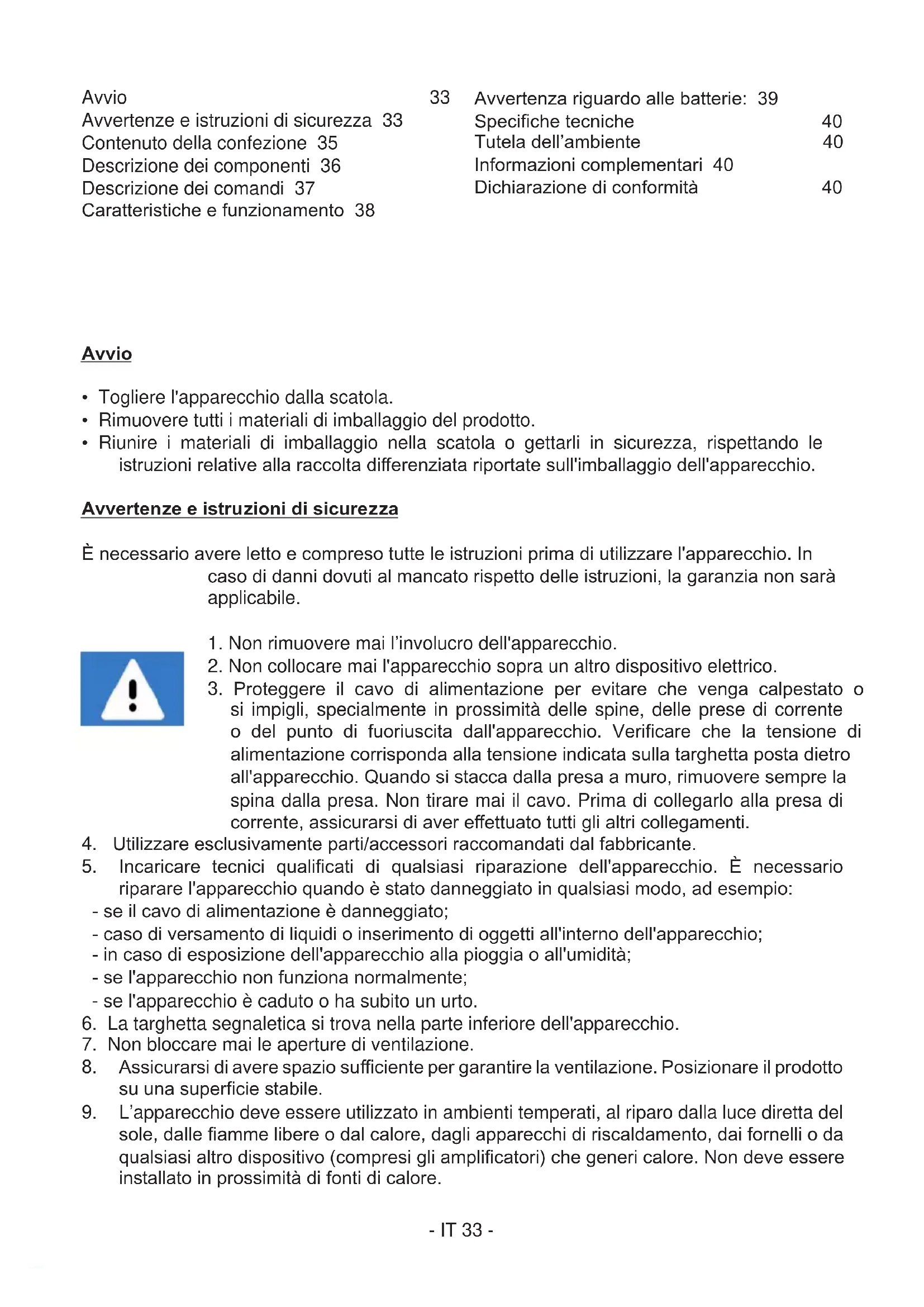 sole, dalle amme libere o dal calore, dagli apparecchi di riscaldamento, dai fornelli o da qualsiasi altro dispositivo (compresi gli amplicatori) che generi calore. Non deve essere inallato in prossimità di fonti di calore. Avvio 33 Avvertenze e istruzioni di sicurezza 33 Contenuto della confezione 35 Descrizione dei componenti 36 Descrizione dei comandi 37 Caratteristiche e funzionamento 38 Avvertenza riguardo alle batterie: 39 Speciche tecniche 40 Tutela dell’ambiente 40 Informazioni complementari 40 Dichiarazione di conformità 40- IT 34 -