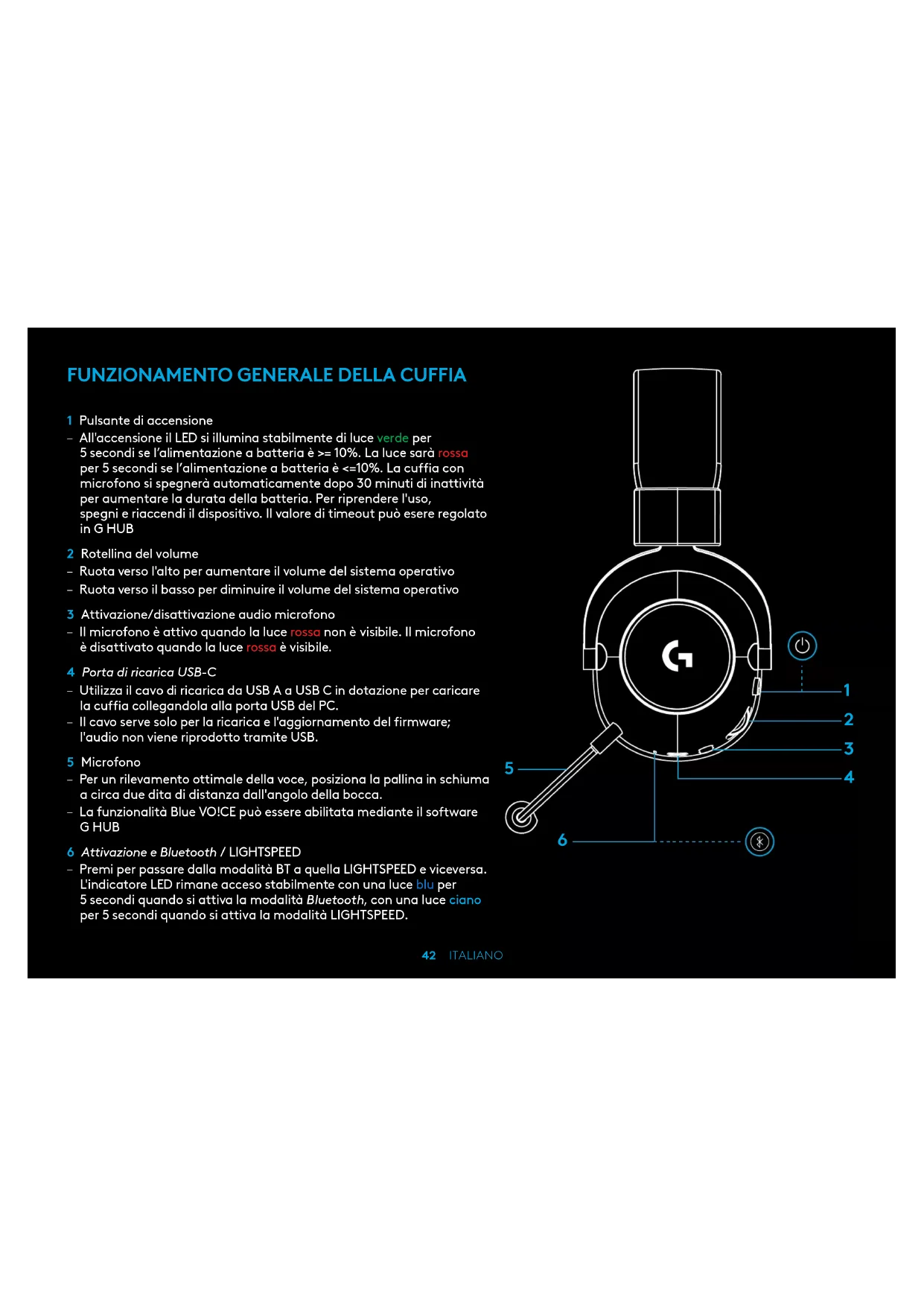 1 Pulsante di accensione – All'accensione il LED si illumina stabilmente di luce verde per 5secondi se l’alimentazione a batteria è >= 10%. La luce sarà rossa per 5 secondi se l’alimentazione a batteria è <=10%. La cua con microfono si spegnerà automaticamente dopo 30 minuti diinattività per aumentare la durata della batteria. Per riprendere l'uso, spegnieriaccendi il dispositivo. Il valore di timeout può esere regolato in G HUB 2 Rotellina del volume – Ruota verso l'alto per aumentare il volume del sistema operativo – Ruota verso il basso per diminuire il volume del sistema operativo 3 Attivazione/disattivazione audio microfono – Il microfono è attivo quando la luce rossa non è visibile. Il microfono èdisattivato quando la luce rossa è visibile. 4 Porta di ricarica USB-C – Utilizza il cavo di ricarica da USB A a USB C in dotazione per caricare la cua collegandola alla porta USB del PC. – Il cavo serve solo per la ricarica e l'aggiornamento del rmware; l'audio non viene riprodotto tramite USB. 5 Microfono – Per un rilevamento ottimale della voce, posiziona la pallina in schiuma a circa due dita di distanza dall'angolo della bocca. – La funzionalità Blue VO!CE può essere abilitata mediante il soware G HUB 6 Attivazione e Bluetooth / LIGHTSPEED – Premi per passare dalla modalità BT a quella LIGHTSPEED e viceversa. L'indicatore LED rimane acceso stabilmente con una luce blu per 5secondi quando si attiva la modalità Bluetooth, con una luce ciano per 5 secondi quando si attiva la modalità LIGHTSPEED.