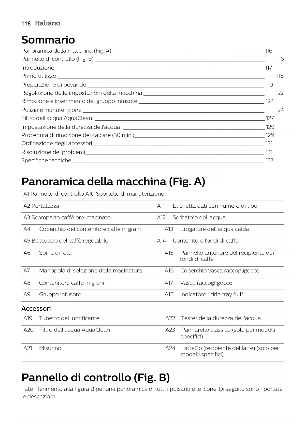 Français Français Caractéristiques techniques Le fabricant se réserve le droit d’améliorer les spécifications techniques du produit. Toutes les quantités prédéfinies sont approximatives. Description ValeurItaliano Sommario Panoramica della macchina (Fig. A) _________________________________________________________________ 116 Pannello di controllo (Fig. B) _________________________________________________________________________ 116 Introduzione _________________________________________________________________________________________ 117 Primo utilizzo _________________________________________________________________________________________ 118 Preparazione di bevande ____________________________________________________________________________ 119 Regolazione delle impostazioni della macchina ____________________________________________________ 122 Rimozione e inserimento del gruppo infusore ______________________________________________________ 124 Pulizia e manutenzione ______________________________________________________________________________ 124 Filtro dell'acqua AquaClean _________________________________________________________________________ 127 Impostazione della durezza dell'acqua _____________________________________________________________ 129 Procedura di rimozione del calcare (30 min.)________________________________________________________ 129 Ordinazione degli accessori__________________________________________________________________________ 131 Risoluzione dei problemi_____________________________________________________________________________ 131 Specifiche tecniche___________________________________________________________________________________ 137 Panoramica della macchina (Fig. A) A1 Pannello di controllo A10 Sportello di manutenzione A2 Portatazza A11 Etichetta dati con numero di tipo A3 Scomparto caffè pre-macinato A12 Serbatoio dell'acqua A4 Coperchio del contenitore caffè in grani A13 Erogatore dell'acqua calda A5 Beccuccio del caffè regolabile A14 Contenitore fondi di caffè A6 Spina di rete A15 Pannello anteriore del recipiente dei fondi di caffè A7 Manopola di selezione della macinatura A16 Coperchio vasca raccogligocce A8 Contenitore caffè in grani A17 Vasca raccogligocce A9 Gruppo infusore A18 Indicatore "'drip tray full" Accessori A19 Tubetto del lubrificante A22 Tester della durezza dell'acqua A20 Filtro dell'acqua AquaClean A23 Pannarello classico (solo per modelli specifici) A21 Misurino A24 LatteGo (recipiente del latte) (solo per modelli specifici) Pannello di controllo (Fig. B) Fate riferimento alla figura B per una panoramica di tutti i pulsanti e le icone. Di seguito sono riportate le descrizioni.