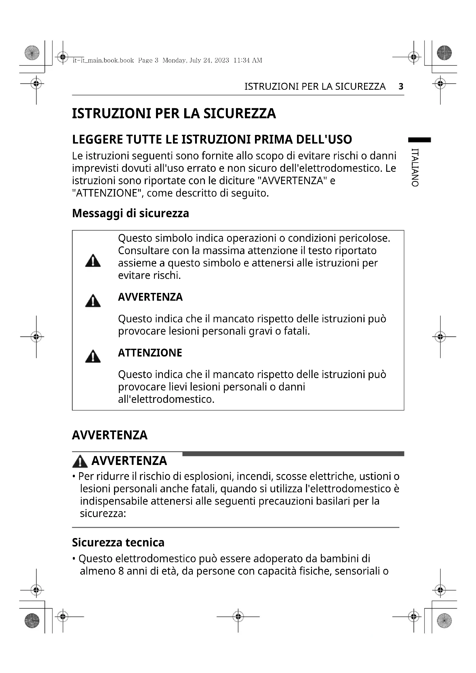 - Questo elettrodomestico può essere adoperato da bambini di almeno 8 anni di età, da persone con capacità fisiche, sensoriali o Questo simbolo indica operazioni o condizioni pericolose. Consultare con la massima attenzione il testo riportato assieme a questo simbolo e attenersi alle istruzioni per evitare rischi. AVVERTENZA Questo indica che il mancato rispetto delle istruzioni può provocare lesioni personali gravi o fatali. ATTENZIONE Questo indica che il mancato rispetto delle istruzioni può provocare lievi lesioni personali o danni all'elettrodomestico. it-it_main.book.book Page 3 Monday, July 24, 2023 11:34 AM4
