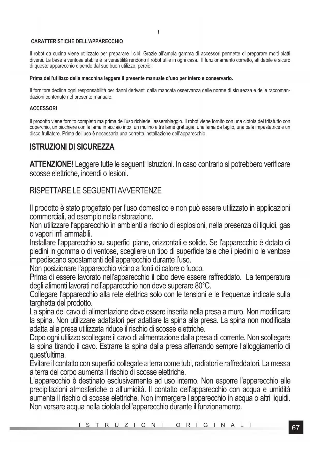 Il prodotto è stato progettato per l’uso domestico e non può essere utilizzato in applicazioni commerciali, ad esempio nella ristorazione. Non utilizzare l’apparecchio in ambienti a rischio di esplosioni, nella presenza di liquidi, gas o vapori infi ammabili. Installare l’apparecchio su superfi ci piane, orizzontali e solide. Se l’apparecchio è dotato di piedini in gomma o di ventose, scegliere un tipo di superfi cie tale che i piedini o le ventose impediscano spostamenti dell’apparecchio durante l’uso. Non posizionare l’apparecchio vicino a fonti di calore o fuoco. Prima di essere lavorato nell’apparecchio il cibo deve essere raff reddato. La temperatura degli alimenti lavorati nell’apparecchio non deve superare 80°C. Collegare l’apparecchio alla rete elettrica solo con le tensioni e le frequenze indicate sulla targhetta del prodotto. La spina del cavo di alimentazione deve essere inserita nella presa a muro. Non modifi care la spina. Non utilizzare adattatori per adattare la spina alla presa. La spina non modifi cata adatta alla presa utilizzata riduce il rischio di scosse elettriche. Dopo ogni utilizzo scollegare il cavo di alimentazione dalla presa di corrente. Non scollegare la spina tirando il cavo. Estrarre la spina dalla presa aff errando sempre l’alloggiamento di quest’ultima. Evitare il contatto con superfi ci collegate a terra come tubi, radiatori e raff reddatori. La messa a terra del corpo aumenta il rischio di scosse elettriche. L’apparecchio è destinato esclusivamente ad uso interno. Non esporre l’apparecchio alle precipitazioni atmosferiche o all’umidità. Il contatto dell’apparecchio con acqua e umidità aumenta il rischio di scosse elettriche. Non immergere l’apparecchio in acqua o altri liquidi. Non versare acqua nella ciotola dell’apparecchio durante il funzionamento.68 ISTRUZIONI ORIGINALI
