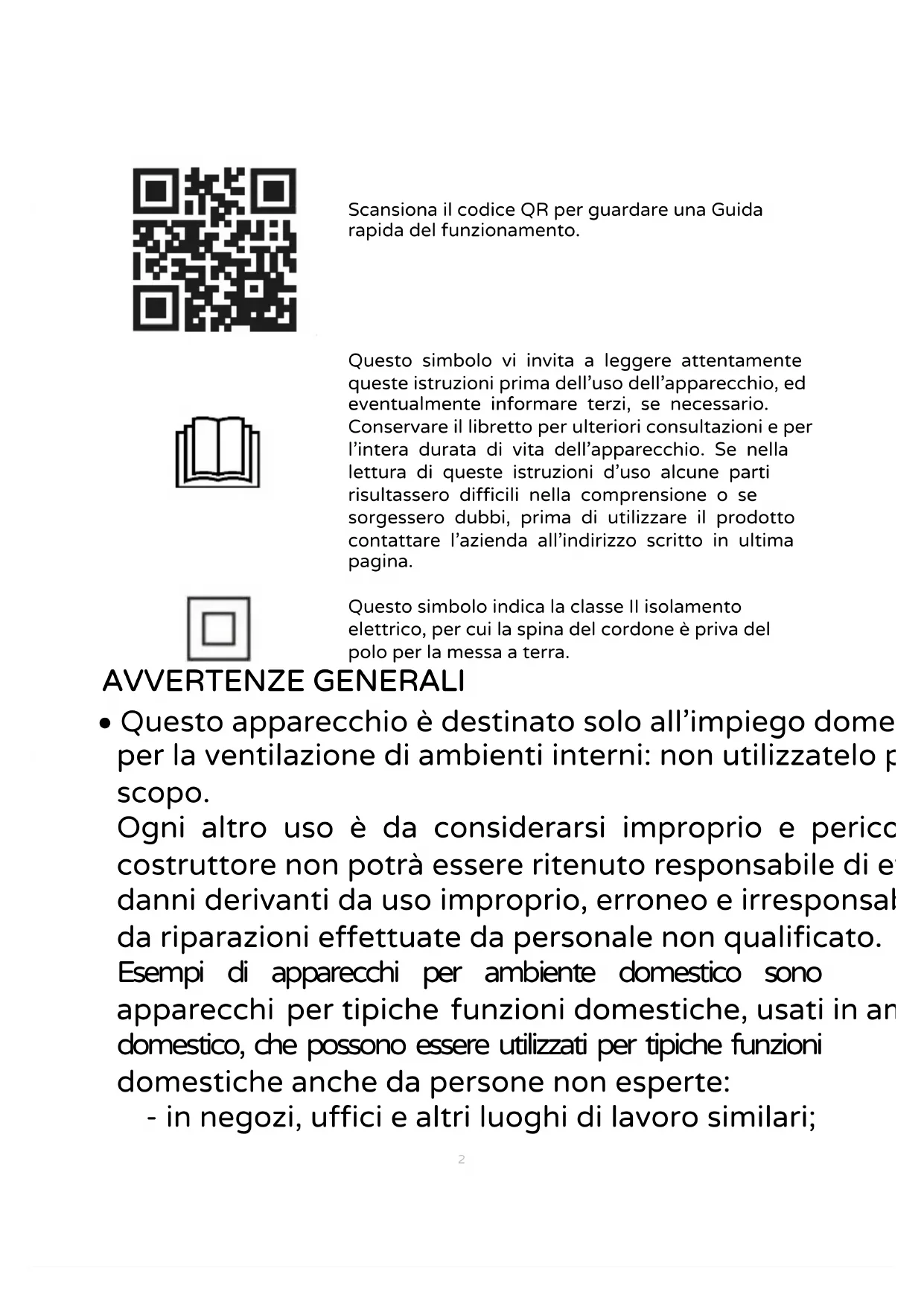 Questo simbolo indica la classe II isolamento elettrico, per cui la spina del cordone è priva del polo per la messa a terra. AVVERTENZE GENERALI Questo apparecchio è destinato solo all’impiego domestico, per la ventilazione di ambienti interni: non utilizzatelo per altro scopo. Ogni altro uso è da considerarsi improprio e pericoloso. Il costruttore non potrà essere ritenuto responsabile di eventuali danni derivanti da uso improprio, erroneo e irresponsabile e/o da riparazioni effettuate da personale non qualificato. Esempi di apparecchi per ambiente domestico sono apparecchi per tipiche funzioni domestiche, usati in ambito domestico, che possono essere utilizzati per tipiche funzioni domestiche anche da persone non esperte: - in negozi, uffici e altri luoghi di lavoro similari;3 - in aziende agricole o similari; - da clienti di alberghi, motel e altri ambienti di tipo residenziale; - in ambienti del tipo bed and breakfast. Non infilare alcun utensile o le dita fra le maglie della griglia di protezione della ventola. Non utilizzare l’apparecchio con temperatura ambiente superiore a 40°C. L’apparecchio può essere utilizzato da bambini di età non inferiore a 8 anni e da persone con ridotte capacità fisiche, sensoriali o mentali, o prive di esperienza o della necessaria conoscenza, purché sotto sorveglianza oppure dopo che le stesse abbiano ricevuto istruzioni relative all’uso sicuro dell’apparecchio e alla comprensione dei pericoli ad esso inerenti. I bambini non devono giocare con l’apparecchio. La pulizia e la manutenzione destinata ad essere effettuata dall’utilizzatore non deve essere effettuata da bambini senza sorveglianza. Questo apparecchio può essere utilizzato da bambini dagli 8 anni in su e da persone con ridotte capacità fisiche, sensoriali o mentali o con mancanza di esperienza o conoscenza se a loro è stata assicurata un’adeguata sorveglianza oppure se hanno ricevuto istruzioni circa l’uso in sicurezza dell’apparecchio e hanno compreso i pericoli correlati. I bambini non devono giocare con l’apparecchio. Le operazioni di pulizia e di manutenzione non devono essere effettuate da bambini a meno che non abbiano più di 8 anni e siano sorvegliati.4 L’apparecchio deve essere mantenuto fuori dalla portata di bambini. Attenzione: quando si utilizzano apparecchi elettrici, occorre sempre rispettare le precauzioni di sicurezza di base per evitare i rischi di incendio, di scosse elettriche e di lesioni fisiche. Non usare l’apparecchio se non funziona correttamente o se sembra danneggiato; in caso di dubbio rivolgersi a personale professionalmente qualificato. Assicurarsi che il ventilatore funzioni correttamente: nel caso contrario spegnere l’apparecchio e farlo controllare da personale professionalmente qualificato. Non spostare l’apparecchio durante il funzionamento. Se l’apparecchio non è in funzione togliere la spina dalla presa di corrente. Scollegare sempre l’apparecchio dalla presa di corrente prima di assemblare, smontare e prima di pulire l’apparecchio. Non lasciare l’apparecchio esposto agli agenti atmosferici (sole, pioggia, ecc.). Non toccare l’apparecchio con mani o piedi bagnati. Non tirare il cavo per spostare l’apparecchio. Non tirare il cavo d’alimentazione o l’apparecchio stesso per disinserire la spina dalla presa di corrente. Se il cavo di alimentazione è danneggiato, esso deve sostituito dal costruttore o dal suo servizio assistenza tecnica o comunque da una persona con qualifica similare, in modo da prevenire ogni rischio.5 Questo apparecchio non è destinato a essere fatto funzionare per mezzo di un temporizzatore esterno o con un sistema di comando a distanza separato, per evitare il rischio di incendio nel caso l’apparecchio sia coperto e/o sia posizionato in modo non corretto o ad altro dispositivo che possa accendere l’apparecchio automaticamente, evitando così rischi di danni a persone, animali o cose. In caso di guasto o cattivo funzionamento spegnere l’apparecchio e farlo controllare da personale professionalmente qualificato; le riparazioni effettuate da personale non qualificato possono essere pericolose e fanno decadere la garanzia. Assicurarsi che il ventilatore sia scollegato dalla rete di alimentazione prima di togliere lo schermo di protezione .