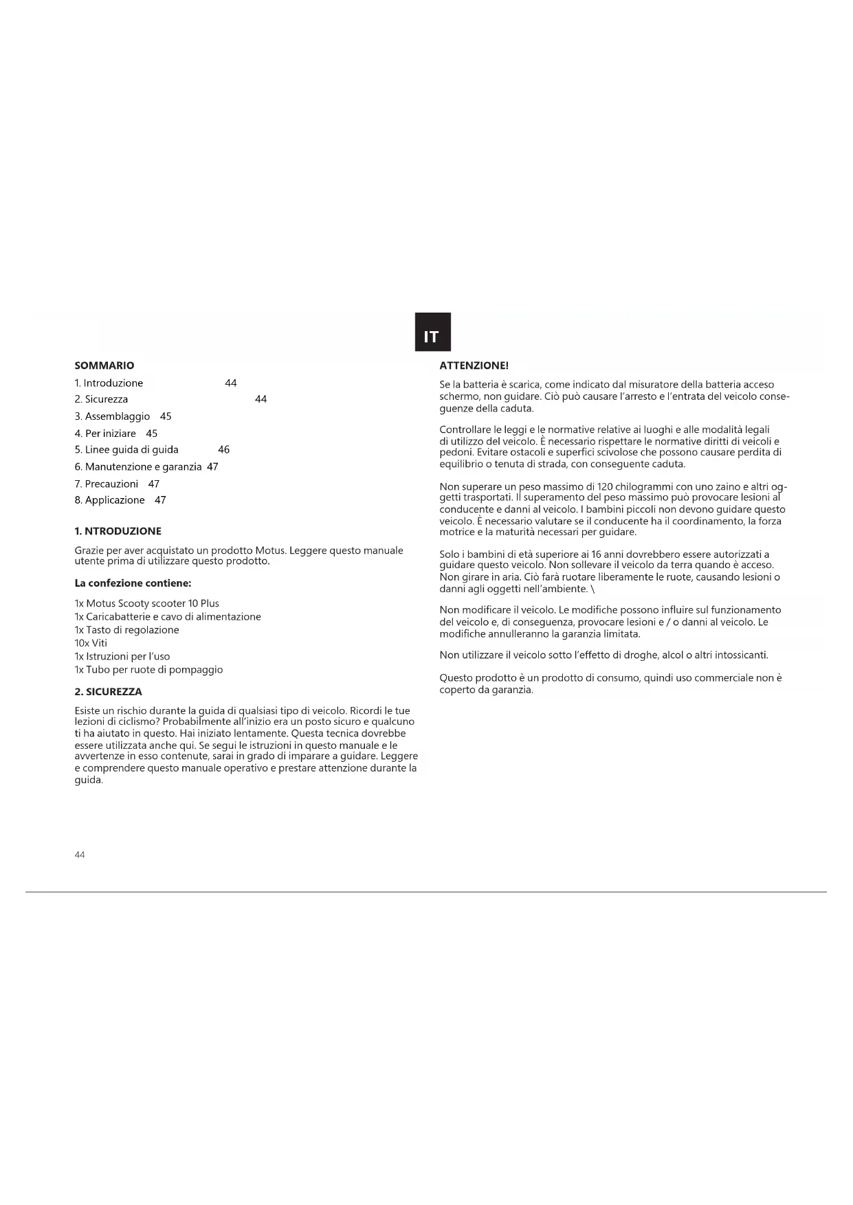 Grazie per aver acquistato un prodotto Motus. Leggere questo manuale utente prima di utilizzare questo prodotto. La confezione contiene: 1x Motus Scooty scooter 10 Plus 1x Caricabatterie e cavo di alimentazione 1x Tasto di regolazione 10x Viti 1x Istruzioni per l’uso 1x Tubo per ruote di pompaggio