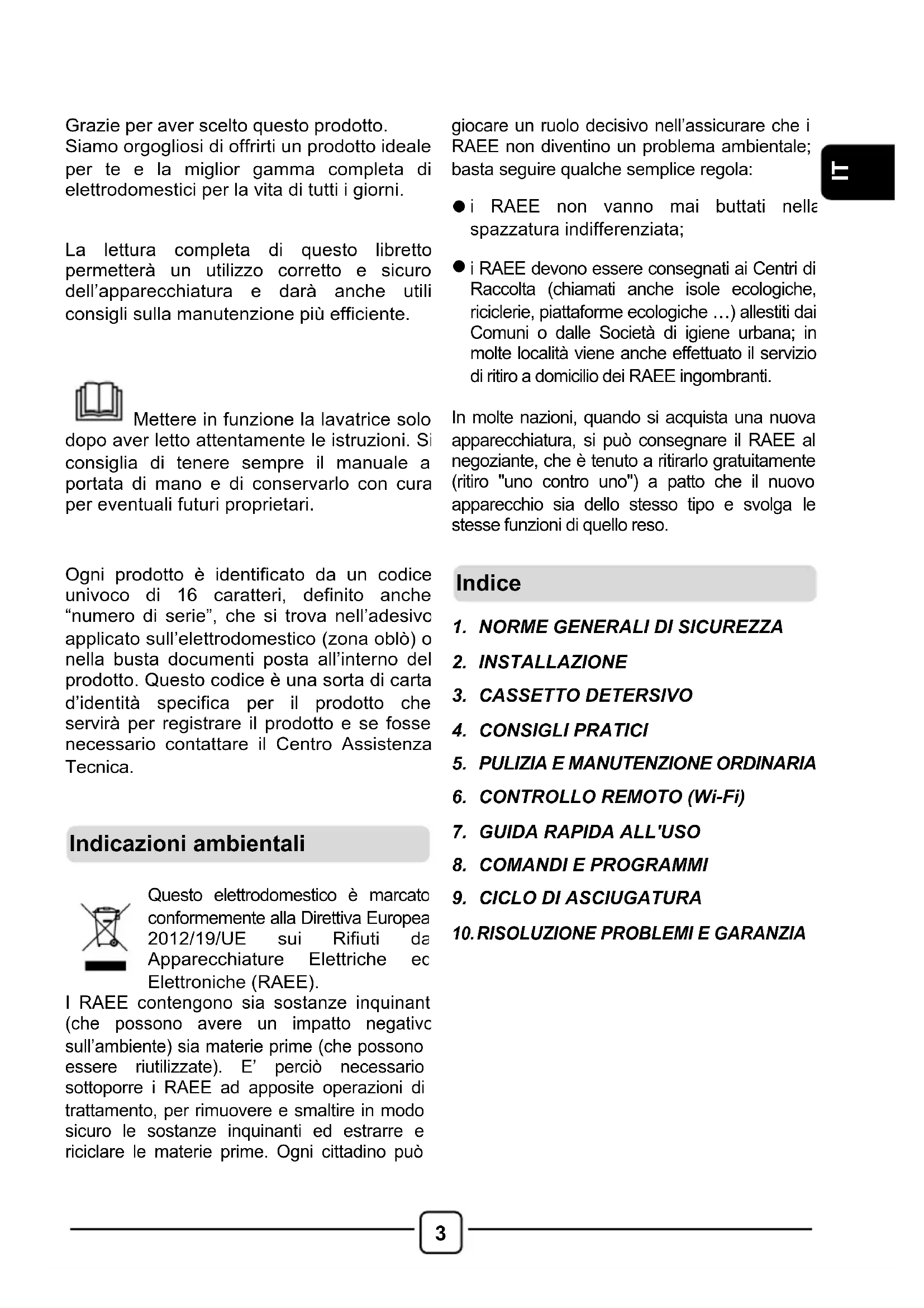 Mettere in funzione la lavatrice solo dopo aver letto attentamente le istruzioni. Si consiglia di tenere sempre il manuale a portata di mano e di conservarlo con cura per eventuali futuri proprietari.