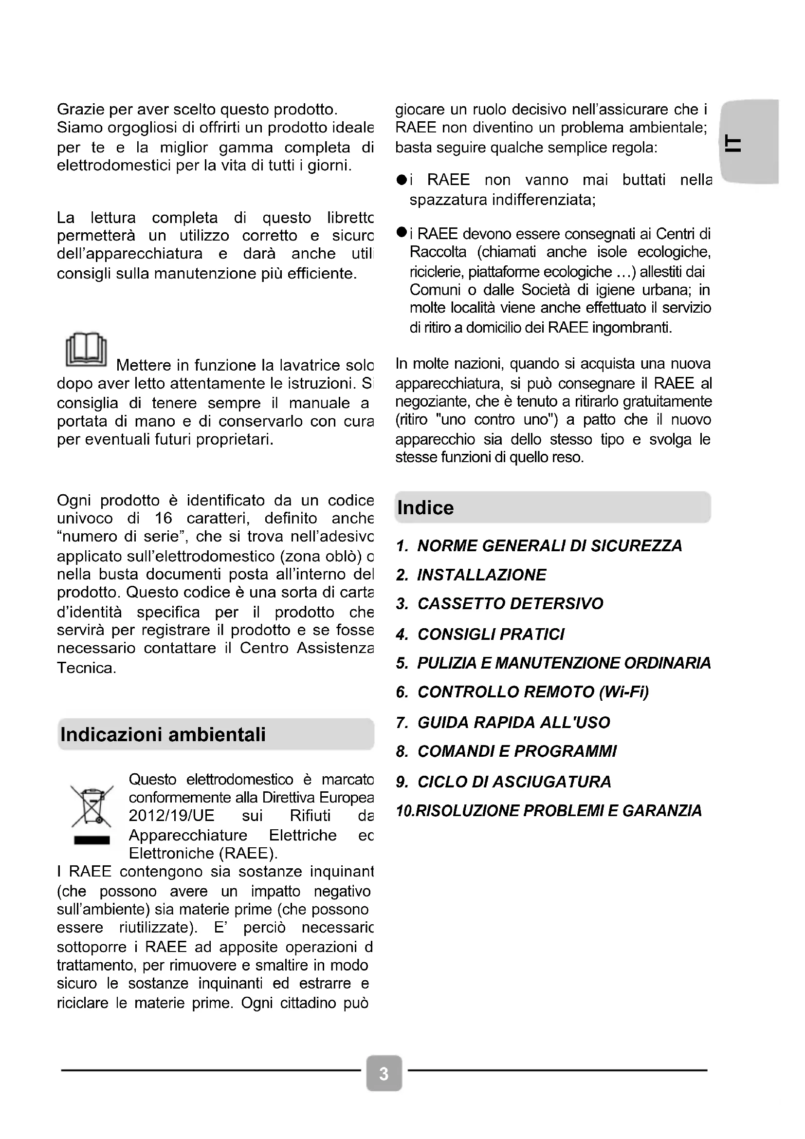 Mettere in funzione la lavatrice solo dopo aver letto attentamente le istruzioni. Si consiglia di tenere sempre il manuale a portata di mano e di conservarlo con cura per eventuali futuri proprietari.