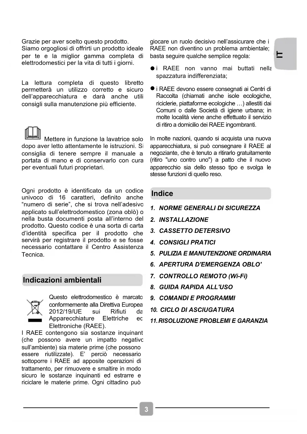 Mettere in funzione la lavatrice solo dopo aver letto attentamente le istruzioni. Si consiglia di tenere sempre il manuale a portata di mano e di conservarlo con cura per eventuali futuri proprietari.