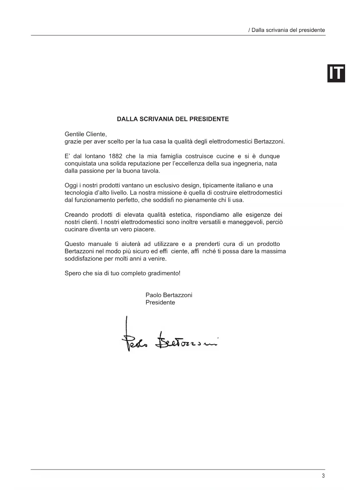 Gentile Cliente, grazie per aver scelto per la tua casa la qualità degli elettrodomestici Bertazzoni. E’ dal lontano 1882 che la mia famiglia costruisce cucine e si è dunque conquistata una solida reputazione per l’eccellenza della sua ingegneria, nata dalla passione per la buona tavola. Oggi i nostri prodotti vantano un esclusivo design, tipicamente italiano e una tecnologia d’alto livello. La nostra missione è quella di costruire elettrodomestici dal funzionamento perfetto, che soddisfi no pienamente chi li usa. Creando prodotti di elevata qualità estetica, rispondiamo alle esigenze dei nostri clienti. I nostri elettrodomestici sono inoltre versatili e maneggevoli, perciò cucinare diventa un vero piacere. Questo manuale ti aiuterà ad utilizzare e a prenderti cura di un prodotto Bertazzoni nel modo più sicuro ed effi ciente, affi nché ti possa dare la massima soddisfazione per molti anni a venire. Spero che sia di tuo completo gradimento! Paolo Bertazzoni Presidente4