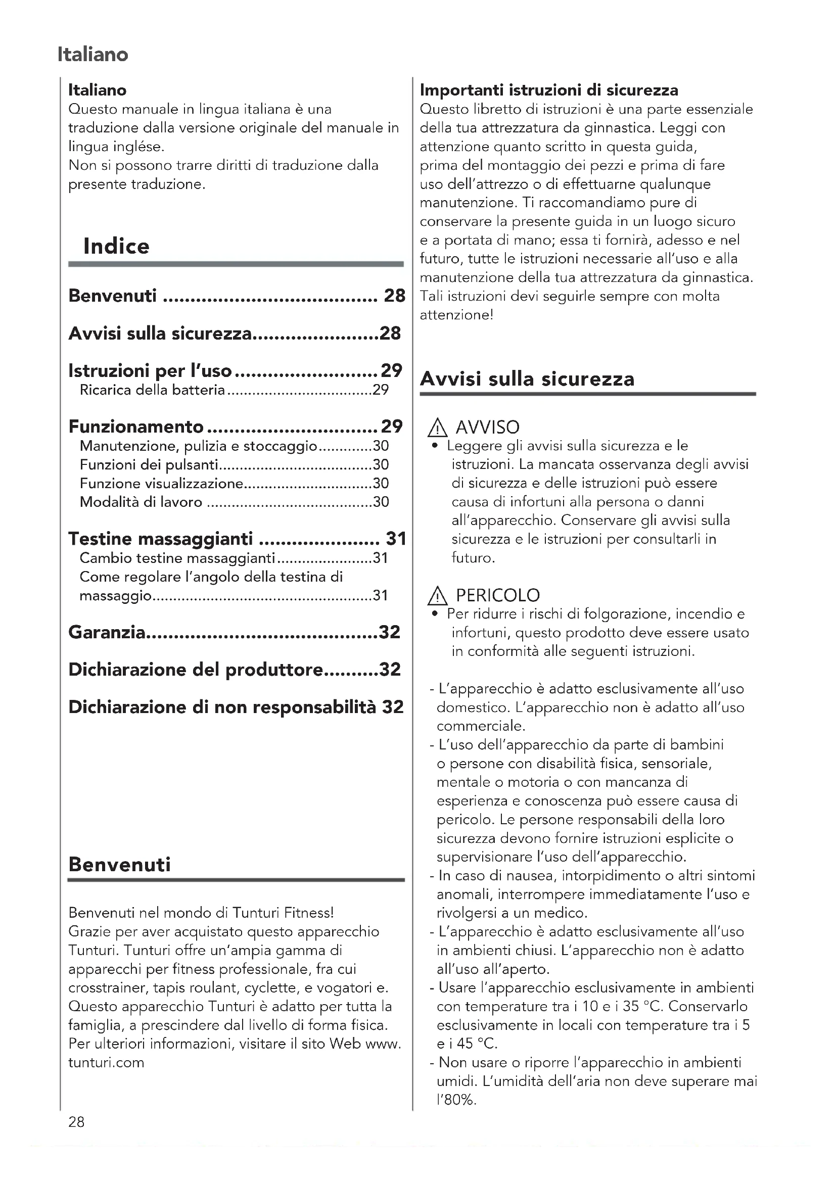 - Per evitare di danneggiare l’applicatore non premere/tirare verso l’interno/esterno in obliquo. Testina a sfera grande schiumata Il design sferico produce una potenza in uscita di tipo propagante e distributivo tra la ricezione e la spinta. La potenza è uniforme e delicata. È adatto al massaggio e al rilassamento del polso, dell’addome, delle natiche e delle gambe. Oltre al rilassamento muscolare prima e dopo l’esercizio, è consigliato agli amanti del fitness leggero come la danza, lo yoga, l’aerobica e così via. Testina piatta piccola schiumata Design piccolo e corto, sulla base del piano è aggiunto un piccolo arco che si adatta al meccanismo di modellazione del corpo e fa sentire meglio. Adatto ai muscoli interni ed esterni dell’addome, del petto e delle gambe del corpo umano. Testina di tipo a U Il percorso di forza tra i due punti è uniforme, la stimolazione avviene ed è potente, e può efficacemente effettuare alcuni semplici massaggi sugli agopunti. La larghezza ragionevole della forma di U si adatta perfettamente alla spina dorsale umane e alle vertebre cervicali e garantisce all’esperienza un senso migliore. Adatta alle spalle, alla colonna cervicale e ai muscoli bilaterali. (Non agire direttamente sulla colonna cervicale e sulla spina dorsale, perché potrebbe provocare lesioni fisiche). Testina a cono schiumata Forma semplice, esperienza con impatto completo, pressione diretta in profondità. Adatta per i meridiani, le piante dei piedi, i palmi, i tendini di Achille, i muscoli romboidi del dorso, ecc. Testina di assorbimento degli urti La testina di assorbimento degli urti può essere utilizzata per gli stessi scopi della testina a sfera grande schiumata, ma è dotata di un assorbimento d’urto incorporato, quindi è più adatta per le parti del corpo sensibili. Testina a pala La testina a pala è progettata per garantire la precisione nei punti più stretti, come tra le scapole o i polpacci. Come regolare l’angolo della testina di massaggio (Fig. B) - Tenere premuto il pulsante “A” sotto l’inserto della testina di massaggio per sbloccare il fissaggio della posizione della testina di massaggio. - Impostare la testina di massaggio nella posizione desiderata e rilasciare il pulsante. - Regolare la posizione delle testine di massaggio finché non si bloccano in posizione.32 Italiano Garanzia Garanzia di acquisto Tunturi Condizioni dell’acquirente Il consumatore beneficia dei diritti legali applicabili previsti dalla legislazione nazionale in materia di commercio di beni di consumo. La garanzia non limita tali diritti. La Garanzia dell’acquirente è valida solo se l’articolo viene utilizzato in un ambiente approvato da Tunturi New Fitness BV per quella particolare attrezzatura. L’ambiente approvato specifico per il prodotto è riportato nel manuale di istruzioni fornito insieme all’apparecchio. Condizioni di garanzia Le condizioni di garanzia iniziano dalla data di acquisto. Le condizioni di garanzia possono variare in base al Paese; consultare il proprio rivenditore locale per conoscerle. Copertura della garanzia In nessun caso Tunturi New Fitness BV o il distributore Tunturi saranno responsabili in virtù della presente garanzia o in altro modo per danni speciali, indiretti, secondari o consequenziali di qualsiasi natura derivanti dall’uso o dall’impossibilità di utilizzare questa apparecchiatura. Questa garanzia esclude: - I danni provocati da incidenti, cattivo uso, manipolazione scorretta o trasporto; - Le unità non usate in conformità alle istruzioni; - Danni che superano il costo del prodotto; - Deterioramento del prodotto consegnato dovuto a una conservazione anomala e/o condizioni di protezione presso i locali del cliente; - Mancata fornitura della prova d’acquisto con la data. La garanzia del prodotto può essere resa nulla dal mancato rispetto delle istruzioni fornite nel manuale di istruzioni. Dichiarazione del produttore Tunturi New Fitness BV dichiara che il prodotto è conforme alle seguenti norme e direttive: EN 957 (HC), 2014/30/EU. Pertanto il prodotto presenta l’etichetta CE. 06-2023 Tunturi New Fitness B.V. Purmerweg 1 1311 XE Almere Paesi Bassi Dichiarazione di non responsabilità © 2023 Tunturi New Fitness BV Tutti i diritti riservati. - Il prodotto e il manuale sono soggetti a modifiche. - Le specifiche tecniche possono essere modificate senza preavviso. - Vedere il nostro sito Web per la versione del manuale più recente.33 Español Español Este manual español es una traducción del texto ingles. No se pueden derivar derechos de esta traducción. El texto original en inglés prevalecerá. Índice ¡Bienvenido ¡Bienvenido al mundo de Tunturi Fitness! Le agradecemos la compra de esta máquina Tunturi. Tunturi ofrece una amplia gama de máquinas de fitness profesionales como bicicletas elípticas, cintas de correr y bicicletas de ejercicio. La máquina Tunturi es adecuada para toda la familia, independientemente del nivel de forma física. Si desea información adicional, visite nuestro sitio web www.tunturi.com ¡Bienvenido 33 Advertencias de seguridad 33 Instrucciones de uso 34 Carga 34 Funcionamiento 34 Mantenimiento, limpieza y almacenamiento 35 Funciones de los botones 35 Función de la pantalla 35 Modos de funcionamiento 35 Cabezales de masaje 36 Cambio de los cabezales de masaje 36 Cómo ajustar el ángulo del cabezal de masaje