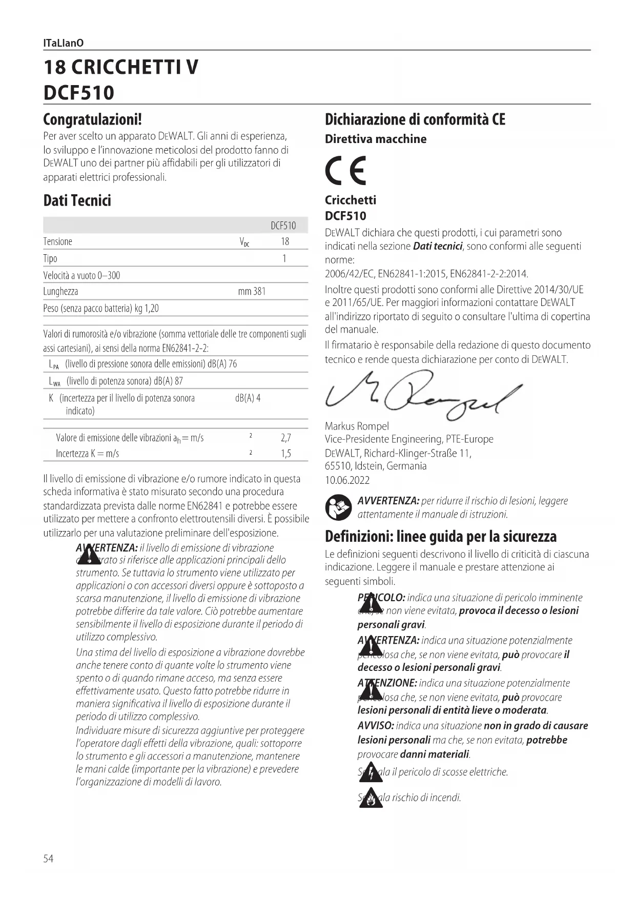 sur les fixations tenaces en relâchant la gâchette et en serrant/desserrant à lamain. REMARQUE : un couple trop important appliqué à la main peut endommager l'enclume s'il dépasse la limite de 101Nm.54 ITaLIanO AVVERTENZA: per ridurre il rischio di lesioni, leggere attentamente il manuale diistruzioni. Definizioni: linee guida per la sicurezza Le definizioni seguenti descrivono il livello di criticità di ciascuna indicazione. Leggere il manuale e prestare attenzione ai seguentisimboli. PERICOLO: indica una situazione di pericolo imminente che, se non viene evitata, provoca il decesso o lesioni personaligravi. AVVERTENZA: indica una situazione potenzialmente pericolosa che, se non viene evitata, può provocare il decesso o lesioni personaligravi. ATTENZIONE: indica una situazione potenzialmente pericolosa che, se non viene evitata, può provocare lesioni personali di entità lieve omoderata. AVVISO: indica una situazione non in grado di causare lesioni personali ma che, se non evitata, potrebbe provocare dannimateriali. Segnala il pericolo di scosseelettriche. Segnala rischio diincendi. Dichiarazione di conformità CE Direttiva macchine Cricchetti DCF510 DeWALT dichiara che questi prodotti, i cui parametri sono indicati nella sezione Dati tecnici, sono conformi alle seguenti norme: 2006/42/EC, EN62841‑1:2015, EN62841‑2‑2:2014.Inoltre questi prodotti sono conformi alle Direttive 2014/30/UE e 2011/65/UE. Per maggiori informazioni contattare DeWALT all'indirizzo riportato di seguito o consultare l'ultima di copertina delmanuale.Il firmatario è responsabile della redazione di questo documento tecnico e rende questa dichiarazione per conto diDeWALT.Markus Rompel Vice‑Presidente Engineering, PTE‑Europe DeWALT, Richard‑Klinger‑Straße 11, 65510, Idstein, Germania 10.06.2022Il livello di emissione di vibrazione e/o rumore indicato in questa scheda informativa è stato misurato secondo una procedura standardizzata prevista dalle norme