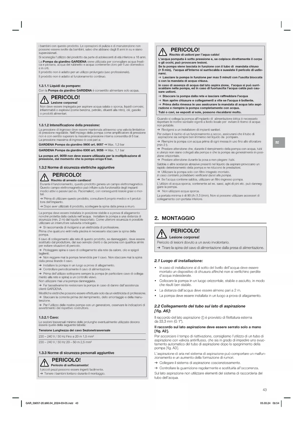 PERICOLO! Rischio di arresto cardiaco!Durante il funzionamento, questo prodotto genera un campo elettromagnetico. Questo campo elettromagnetico può influire sulla funzionalità degli impianti medici attivi o passivi (ad es. Pacemaker), con conseguenti lesioni gravi o mor-tali. v Prima di utilizzare questo prodotto, consultare il proprio medico e il produt- tore dell’impianto. v Dopo aver utilizzato il prodotto, scollegare la spina dalla presa a muro. La pompa deve essere installata in posizione stabile e a prova di allagamento nonché protetta dalla caduta nell’acqua. Installare la pompa a una distanza di sicurezza (min. 2 m) dal liquido trasportato. Come ulteriore sicurezza è possibile utilizzare un interruttore salvavita omologato.v Si raccomanda di rivolgersi a un elettricista di professione.Prima che qualcuno entri nella piscina è necessario staccare la spina della pompa.Il cavo di collegamento alla rete di questo prodotto, se danneggiato, deve essere sostituito dal produttore, dal suo servizio clienti o da persona con qualifica simile per evitare situazioni di pericolo.v Proteggere spina e cavo di collegamento alla rete da calore, olio e spigoli taglienti.v Non reggere mai la pompa tenendola per il cavo. Non staccare mai la spina dalla presa tirando il cavo.v Installare la pompa in un luogo a prova di allagamento.v Controllare periodicamente il cavo di alimentazione.v Prima dell’utilizzo sottoporre sempre la pompa (in particolare cavo di collega-mento alla rete e spina) a un controllo visivo.Non utilizzare mai una pompa danneggiata.v Far tassativamente revisionare la pompa in caso di danno dall’assistenza clienti GARDENA.Modifiche elettriche possono essere effettuate solo da un elettricista di professione.v Staccare la corrente prima del riempimento, dello smontaggio e della manu-tenzione.v Per l’utilizzo delle nostre pompe con un generatore, osservare le indicazioni di avvertimento del rispettivo costruttore.1.3.2.1 Cavo:Le sezioni trasversali minime delle prolunghe eventualmente utilizzate devono essere quelle della seguente tabella:Tensione Lunghezza del cavo Sezione trasversale230 – 240 V / 50 Hz Fino a 20 m 1,5 mm²230 – 240 V / 50 Hz 20 – 50 m 2,5 mm²