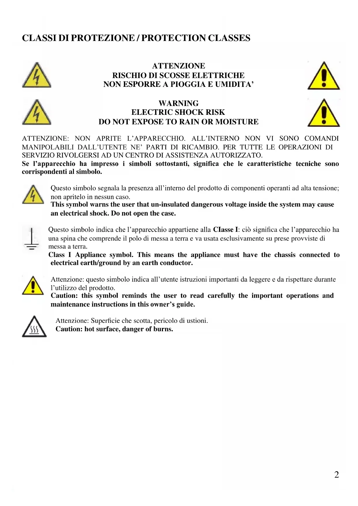 DO NOT EXPOSE TO RAIN OR MOISTURE ATTENZIONE: NON APRITE L’APPARECCHIO. ALL’INTERNO NON VI SONO COMANDI MANIPOLABILI DALL’UTENTE NE’ PARTI DI RICAMBIO. PER TUTTE LE OPERAZIONI DI SERVIZIO RIVOLGERSI AD UN CENTRO DI ASSISTENZA AUTORIZZATO. Se l’apparecchio ha impresso i simboli sottostanti, significa che le caratteristiche tecniche sono corrispondenti al simbolo. Questo simbolo segnala la presenza all’interno del prodotto di componenti operanti ad alta tensione; non apritelo in nessun caso. This symbol warns the user that un-insulated dangerous voltage inside the system may cause an electrical shock. Do not open the case. Questo simbolo indica che l’apparecchio appartiene alla CIasse I: ciò significa che l’apparecchio ha una spina che comprende il polo di messa a terra e va usata esclusivamente su prese provviste di messa a terra. Class I Appliance symbol. This means the appliance must have the chassis connected to electrical earth/ground by an earth conductor. Attenzione: questo simbolo indica all’utente istruzioni importanti da leggere e da rispettare durante l’utilizzo del prodotto. Caution: this symbol reminds the user to read carefully the important operations and maintenance instructions in this owner’s guide. Attenzione: Superficie che scotta, pericolo di ustioni. Caution: hot surface, danger of burns.3