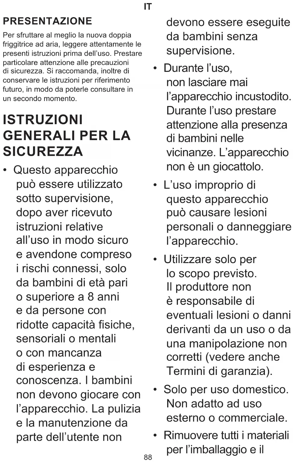 - Questo apparecchio può essere utilizzato sotto supervisione, dopo aver ricevuto istruzioni relative all’uso in modo sicuro e avendone compreso i rischi connessi, solo da bambini di età pari o superiore a 8 anni e da persone con ULGRWWHFDSDFLWj¿VLFKH sensoriali o mentali o con mancanza di esperienza e conoscenza. I bambini non devono giocare con l’apparecchio. La pulizia e la manutenzione da parte dell’utente non devono essere eseguite da bambini senza supervisione.