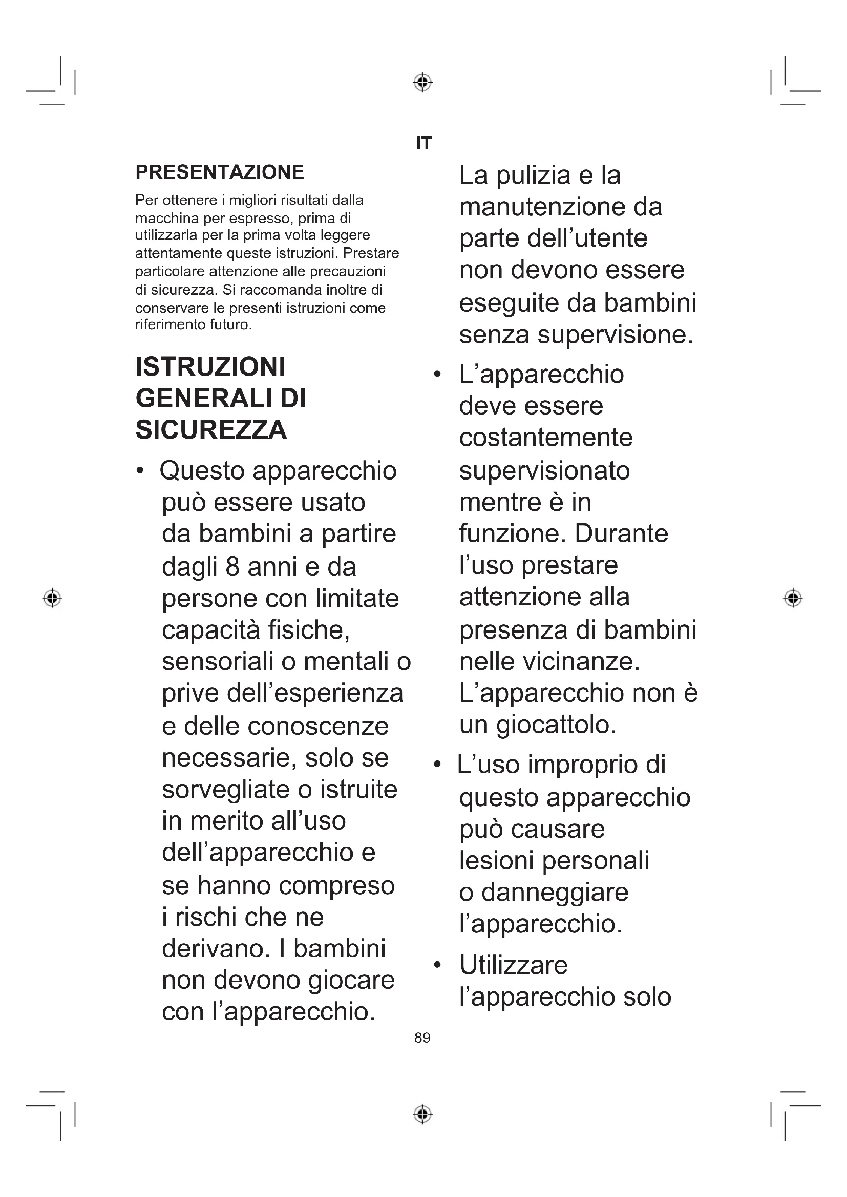 PRESENTAZIONE Per ottenere i migliori risultati dalla macchina per espresso, prima di utilizzarla per la prima volta leggere attentamente queste istruzioni. Prestare particolare attenzione alle precauzioni di sicurezza. Si raccomanda inoltre di conservare le presenti istruzioni come riferimento futuro. ISTRUZIONI GENERALI DI SICUREZZA