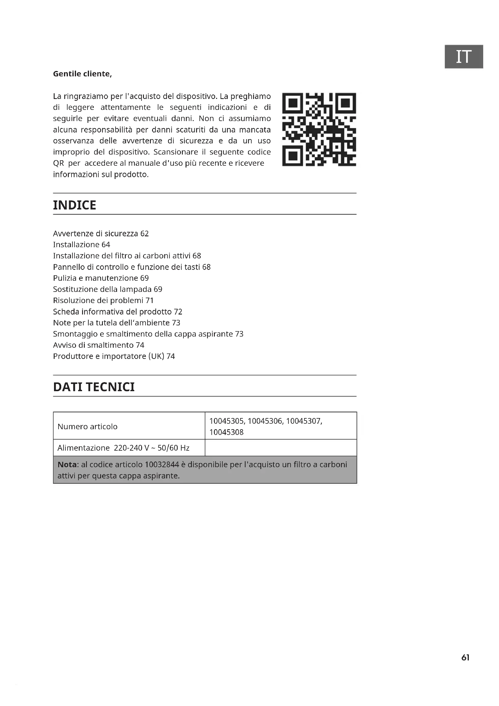 Gentile cliente, La ringraziamo per l'acquisto del dispositivo. La preghiamo di leggere attentamente le seguenti indicazioni e di seguirle per evitare eventuali danni. Non ci assumiamo alcuna responsabilità per danni scaturiti da una mancata osservanza delle avvertenze di sicurezza e da un uso improprio del dispositivo. Scansionare il seguente codice QR per accedere al manuale d'uso più recente e ricevere informazioni sul prodotto. INDICE Avvertenze di sicurezza 62 Installazione 64 Installazione del ltro ai carboni attivi 68 Pannello di controllo e funzione dei tasti 68 Pulizia e manutenzione 69 Sostituzione della lampada 69 Risoluzione dei problemi 71 Scheda informativa del prodotto 72 Note per la tutela dell‘ambiente 73 Smontaggio e smaltimento della cappa aspirante 73 Avviso di smaltimento 74 Produttore e importatore (UK) 74 DATI TECNICI Numero articolo 10045305, 10045306, 10045307,