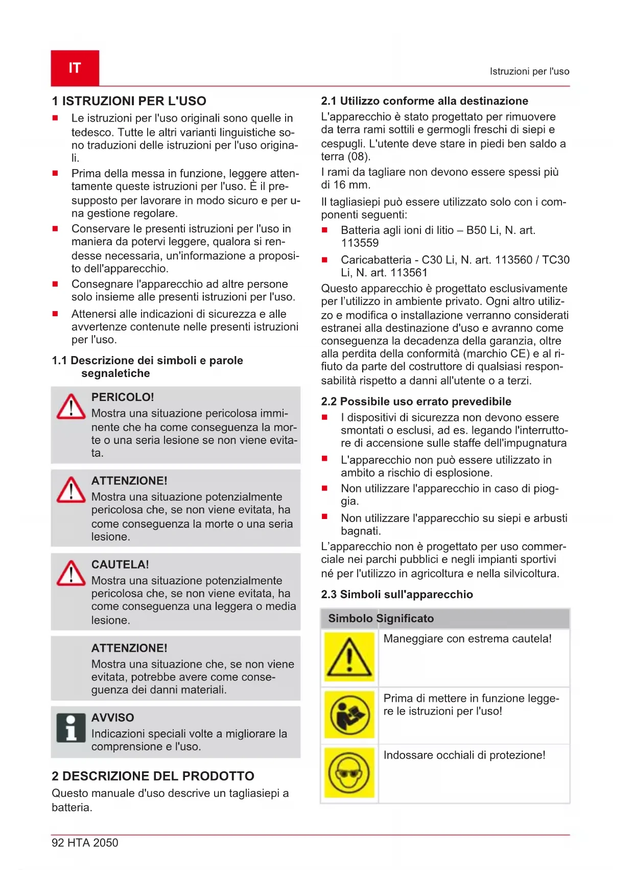La panoramica prodotto (01) offre uno sguardo d'insieme sull'apparecchio. N. Componente 1 Maniglia con interruttore di sicurez- za e interruttore ON/OFF 2 Barra telescopica 3 Vite di serraggio 4 Occhiello per tracolla 5 Testina con perno 6 Lama di taglio 7 Accumulatore con arresto* 8 Caricabatterie con connettore* 9 Coperchio protettivo della lama 10 Bretella 11 Istruzioni per l'uso *Non in dotazione.IT 94 HTA 2050 Indicazioni di sicurezza generali per attrezzi elettrici