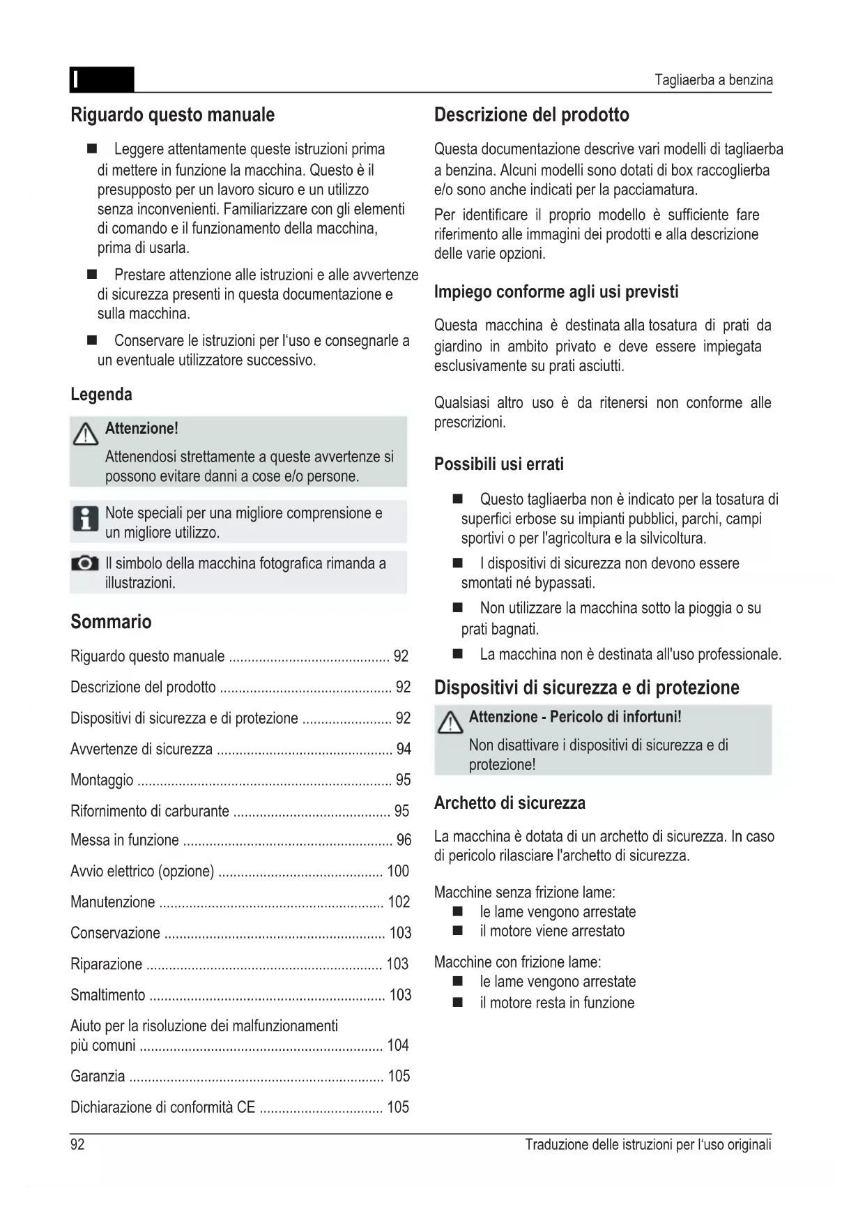 - Dichiarazione di conformità CE Riguardo questo manuale Leggere attentamente queste istruzioni prima di mettere in funzione la macchina. Questo è il presupposto per un lavoro sicuro e un utilizzo senza inconvenienti. Familiarizzare con gli elementi di comando e il funzionamento della macchina, prima di usarla. Prestare attenzione alle istruzioni e alle avvertenze di sicurezza presenti in questa documentazione e sulla macchina. Conservare le istruzioni per l‘uso e consegnarle a un eventuale utilizzatore successivo. Legenda Attenzione! Attenendosi strettamente a queste avvertenze si possono evitare danni a cose e/o persone. Note speciali per una migliore comprensione e un migliore utilizzo. Il simbolo della macchina fotograca rimanda a illustrazioni. Descrizione del prodotto Questa documentazione descrive vari modelli di tagliaerba a benzina. Alcuni modelli sono dotati di box raccoglierba e/o sono anche indicati per la pacciamatura. Per identicare il proprio modello è sufciente fare riferimento alle immagini dei prodotti e alla descrizione delle varie opzioni. Impiego conforme agli usi previsti Questa macchina è destinata alla tosatura di prati da giardino in ambito privato e deve essere impiegata esclusivamente su prati asciutti. Qualsiasi altro uso è da ritenersi non conforme alle prescrizioni. Possibili usi errati Questo tagliaerba non è indicato per la tosatura di superci erbose su impianti pubblici, parchi, campi sportivi o per l'agricoltura e la silvicoltura. I dispositivi di sicurezza non devono essere smontati né bypassati. Non utilizzare la macchina sotto la pioggia o su prati bagnati. La macchina non è destinata all'uso professionale. Dispositivi di sicurezza e di protezione Attenzione - Pericolo di infortuni! Non disattivare i dispositivi di sicurezza e di protezione! Archetto di sicurezza La macchina è dotata di un archetto di sicurezza. In caso di pericolo rilasciare l'archetto di sicurezza. Macchine senza frizione lame: le lame vengono arrestate il motore viene arrestato Macchine con frizione lame: le lame vengono arrestate il motore resta in funzioneI 93470 591_c 1 Fune di avviamento 9 Regolazione in altezza progressiva* 2 Avvio, stop* 10 Frizione lame* 3 Trazione ruote* 11 Trasmissione Vario* 4 Archetto di sicurezza 12 Istruzioni per l'uso 5 Regolazione in altezza ergonomica* 13 Inserto per scarico* 6 Indicatore di riempimento* 14 Sportello di chiusura* 7 Sportello di protezione* 15 Kit pacciamatura* 8 Box raccoglierba* * a seconda del modello Simboli sulla macchina Attenzione! Particolare attenzione durante l'impiego. Prima di eseguire dei lavori sulla lama completa estrarre il cappuccio della candela di accensione. Prima della messa in funzione leggere le istruzioni d'uso! Rilasciare il freno motore. Tenere lontano le altre persone dalla zona di pericolo! Inserire la trazione ruote. Tenere mani e piedi lontano dalla lama completa! p. 105