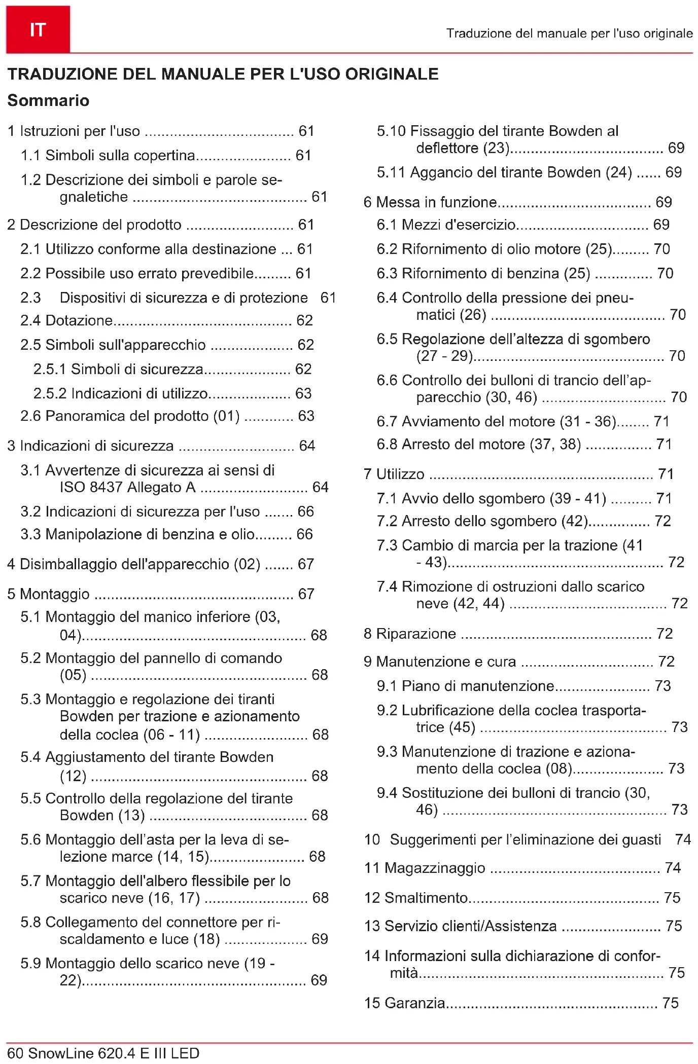 Motori a scoppio (valgono qui le disposizioni di garanzia dei rispettivi costruttori del motore) Il periodo di garanzia inizia con l'acquisto da parte del primo consumatore finale. Fa fede la data ripor- tata sulla ricevuta di acquisto. Rivolgersi al proprio rivenditore o al centro di assistenza autorizzato più vicino presentando la presente garanzia e la ricevuta di acquisto originale. La presente dichiarazione di garanzia non altera i diritti derivanti da vizi del prodotto spettanti per legge all'acquirente nei con- fronti del venditore.SI 76 SnowLine 620.4 E III LED Prevod originalnih navodil
