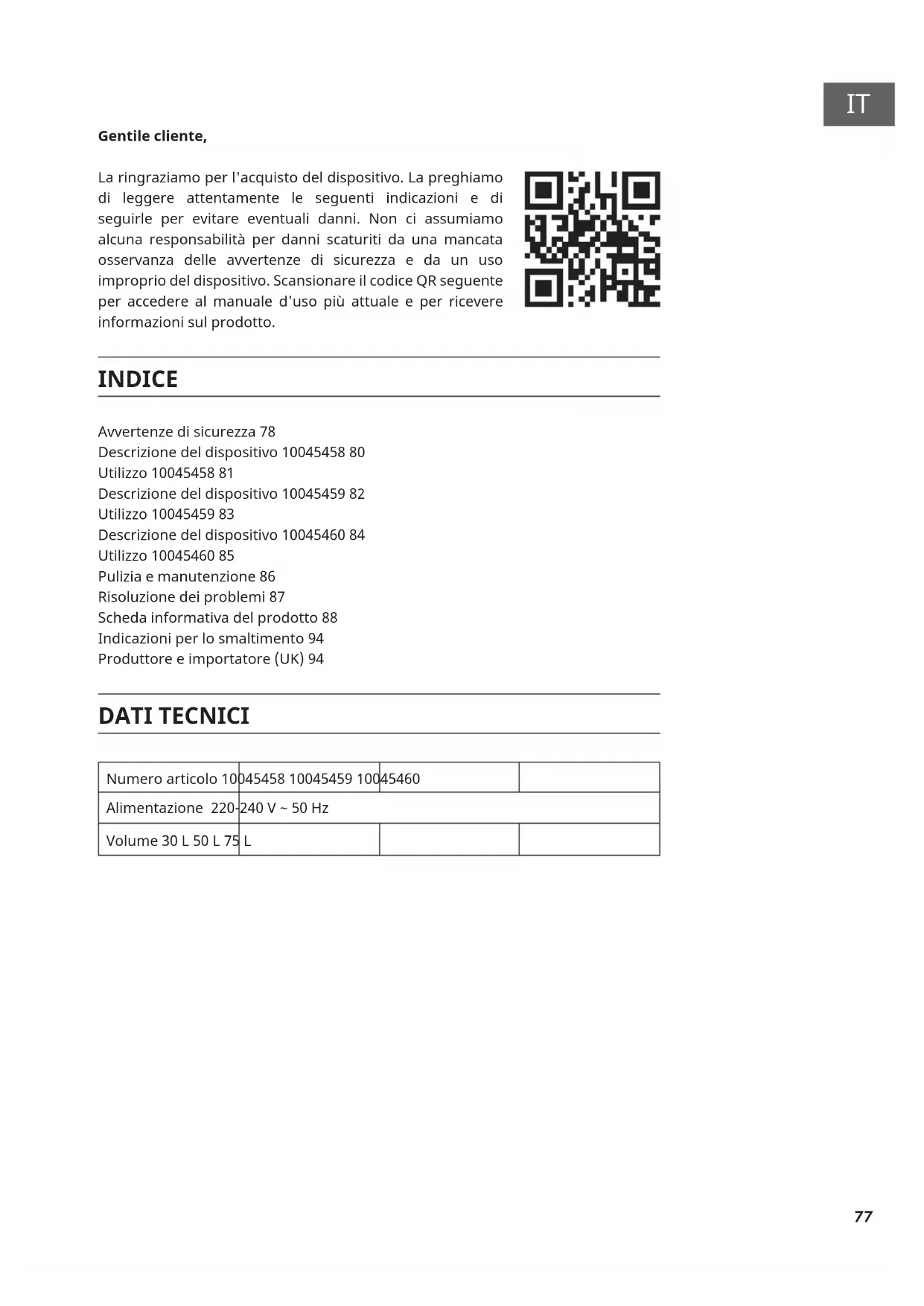 Gentile cliente, La ringraziamo per l'acquisto del dispositivo. La preghiamo di leggere attentamente le seguenti indicazioni e di seguirle per evitare eventuali danni. Non ci assumiamo alcuna responsabilità per danni scaturiti da una mancata osservanza delle avvertenze di sicurezza e da un uso improprio del dispositivo. Scansionare il codice QR seguente per accedere al manuale d'uso più attuale e per ricevere informazioni sul prodotto. INDICE Avvertenze di sicurezza 78 Descrizione del dispositivo 10045458 80 Utilizzo 10045458 81 Descrizione del dispositivo 10045459 82 Utilizzo 10045459 83 Descrizione del dispositivo 10045460 84 Utilizzo 10045460 85 Pulizia e manutenzione 86 Risoluzione dei problemi 87 Scheda informativa del prodotto 88 Indicazioni per lo smaltimento 94 Produttore e importatore (UK) 94 DATI TECNICI Numero articolo 10045458 10045459 10045460 Alimentazione 220-240 V ~ 50 Hz Volume 30 L 50 L 75 L78