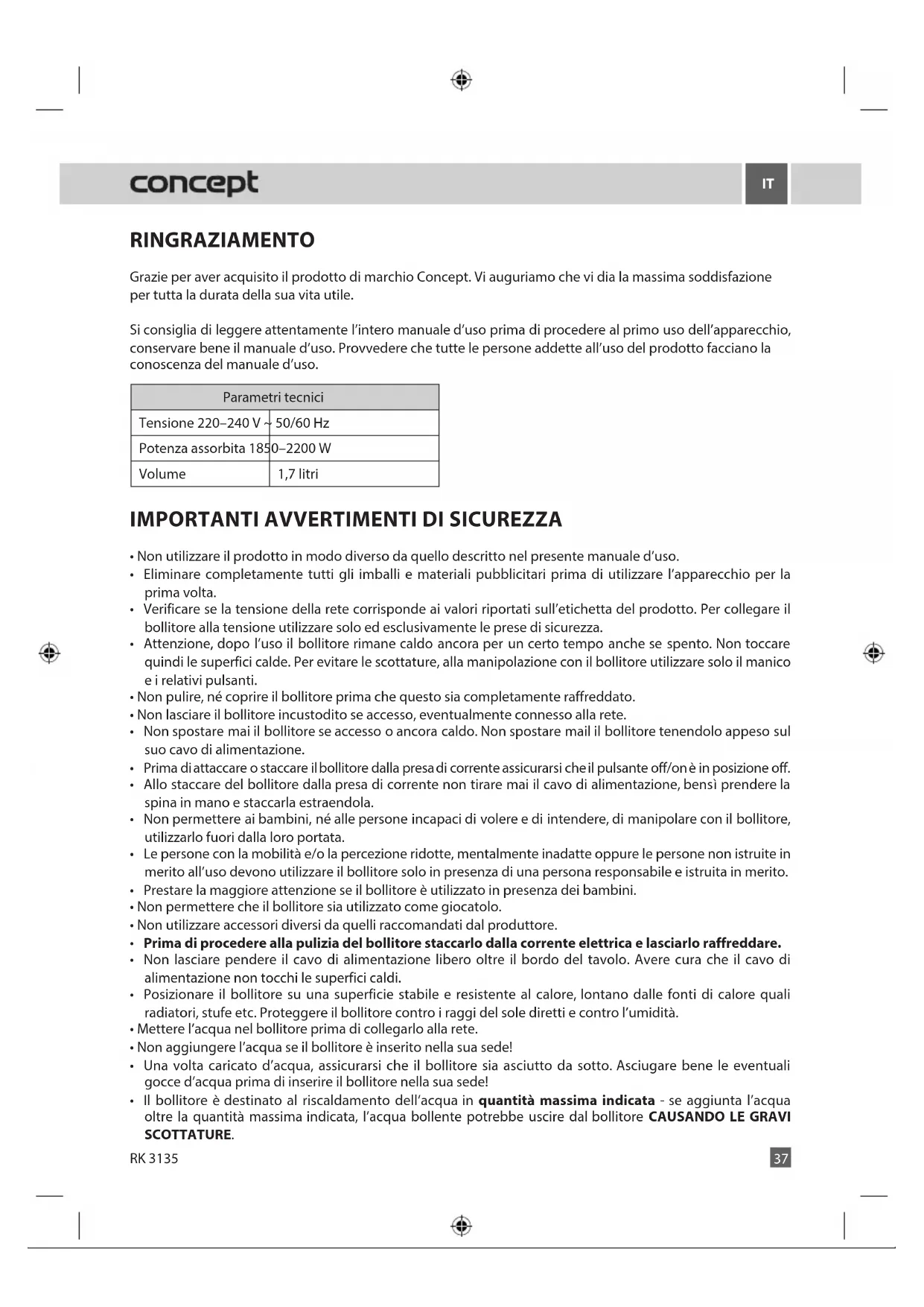RINGRAZIAMENTO Grazie per aver acquisito il prodotto di marchio Concept. Vi auguriamo che vi dia la massima soddisfazione per tutta la durata della sua vita utile. Si consiglia di leggere attentamente l’intero manuale d’uso prima di procedere al primo uso dell’apparecchio, conservare bene il manuale d’uso. Provvedere che tutte le persone addette all’uso del prodotto facciano la conoscenza del manuale d’uso. Parametri tecnici Tensione 220–240 V ~ 50/60 Hz Potenza assorbita 1850–2200 W Volume 1,7 litri
