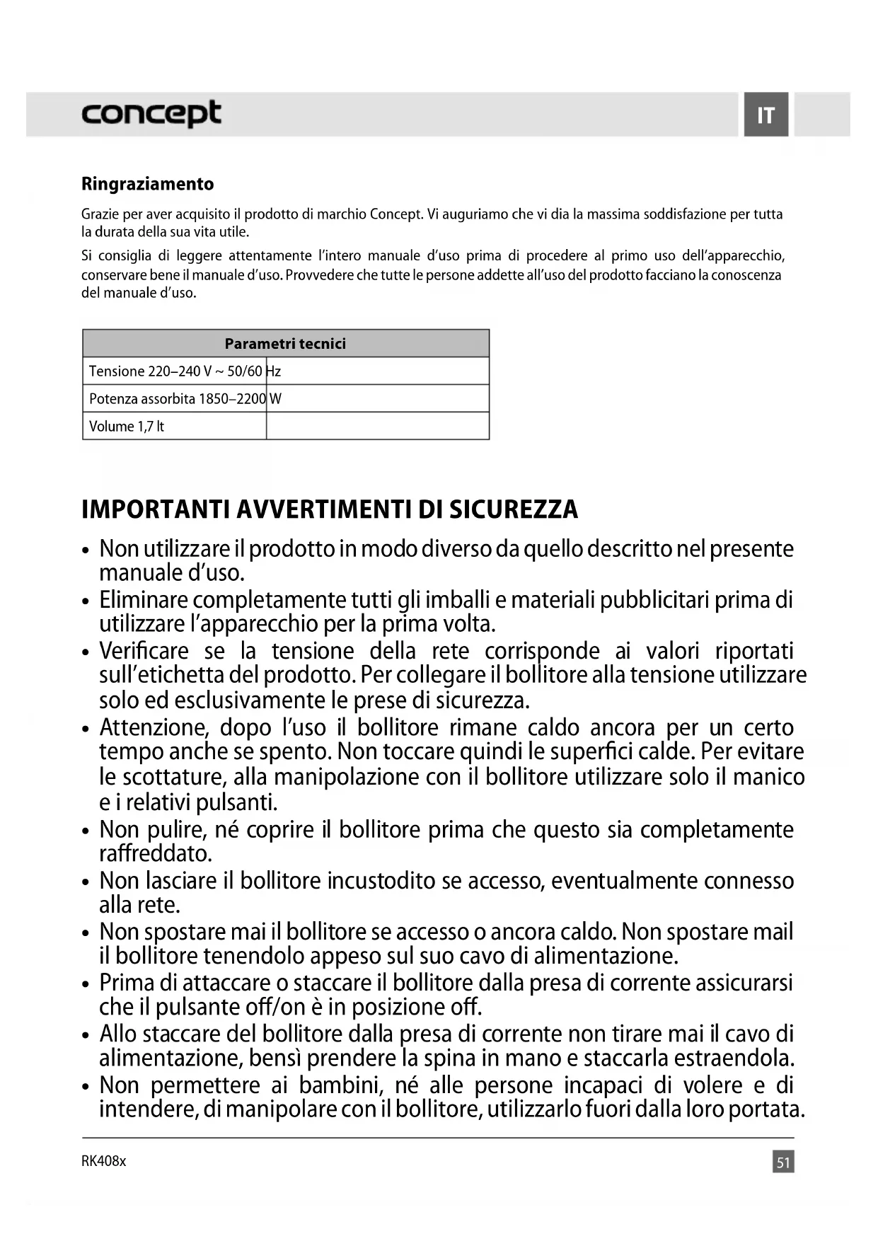 AVVERTIMENTI: Prima di utilizzare il bollitore per un uso concreto si suggerisce di caricarlo d’acqua di riscaldarla e di buttarla. Tale operazione è da ripetere 3 volte. Solo dopo il bollitore è pronto per l’uso. Il bollitore può essere utilizzato solo ed esclusivamente con la sua sede originale.55 RK408x