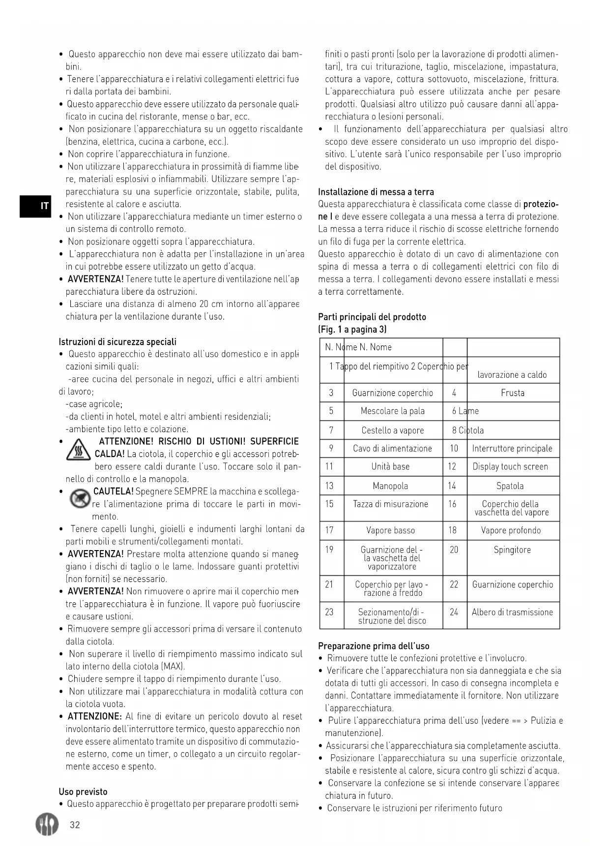ne I e deve essere collegata a una messa a terra di protezione. La messa a terra riduce il rischio di scosse elettriche fornendo un filo di fuga per la corrente elettrica. Questo apparecchio è dotato di un cavo di alimentazione con spina di messa a terra o di collegamenti elettrici con filo di messa a terra. I collegamenti devono essere installati e messi a terra correttamente. Parti principali del prodotto (Fig. 1 a pagina 3) N. Nome N. Nome 1 Tappo del riempitivo 2 Coperchio per lavorazione a caldo 3 Guarnizione coperchio 4 Frusta 5 Mescolare la pala 6 Lame 7 Cestello a vapore 8 Ciotola 9 Cavo di alimentazione 10 Interruttore principale 11 Unità base 12 Display touch screen 13 Manopola 14 Spatola 15 Tazza di misurazione 16 Coperchio della vaschetta del vapore 17 Vapore basso 18 Vapore profondo 19 Guarnizione del
