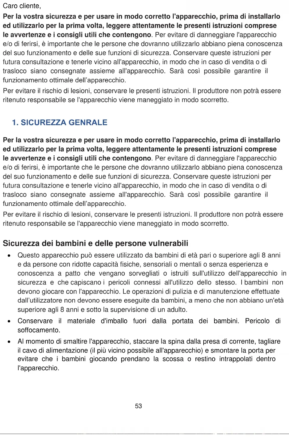 Per la vostra sicurezza e per usare in modo corretto l'apparecchio, prima di installarlo ed utilizzarlo per la prima volta, leggere attentamente le presenti istruzioni comprese le avvertenze e i consigli utili che contengono. Per evitare di danneggiare l'apparecchio e/o di ferirsi, è importante che le persone che dovranno utilizzarlo abbiano piena conoscenza del suo funzionamento e delle sue funzioni di sicurezza. Conservare queste istruzioni per futura consultazione e tenerle vicino all'apparecchio, in modo che in caso di vendita o di trasloco siano consegnate assieme all'apparecchio. Sarà così possibile garantire il funzionamento ottimale dell’apparecchio. Per evitare il rischio di lesioni, conservare le presenti istruzioni. Il produttore non potrà essere ritenuto responsabile se l'apparecchio viene maneggiato in modo scorretto. Sicurezza dei bambini e delle persone vulnerabili
