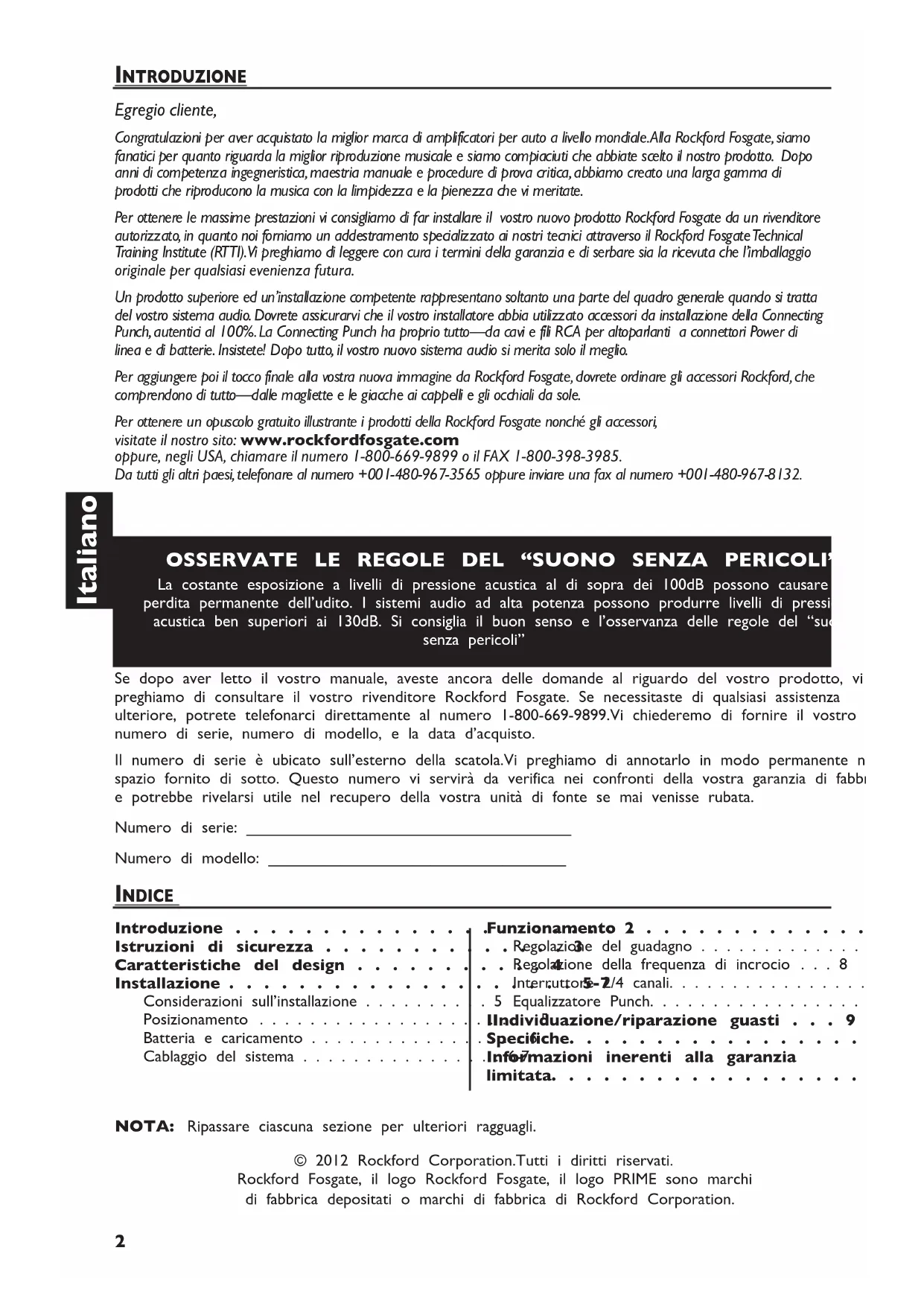 PRIMI PASSI Benvenuti alla Rockford Fosgate! Questo manuale è stato concepito per fornire ragguagli al proprietario, al rivenditore e all’installatore. Per coloro che desiderano informazioni rapide circa l’installazione di questo prodotto, vi preghiamo di consultare la sezione Installazione di questo manuale.Altri ragguagli sono disponibili attraverso l’Indice. Alla Rockford Fosgate, abbiamo fatto di tutto per assicurarci che tutte le informazioni contenute in questo manuale fossero d’uso corrente. Pertanto, dato che siamo sempre alla ricerca di nuovi modi per migliorare i nostri prodotti, tali informazioni sono soggette a modifiche senza preavviso. Vi preghiamo di visitare il nostro sito internet per le più recenti informazioni su tutti i prodotti Rockford. www.rockfordfosgate.com Il kit per gli attrezzi compreso con ciascun amplificatore contiene tutti gli attrezzi da montaggio necessari per fissare l’amplificatore al veicolo.