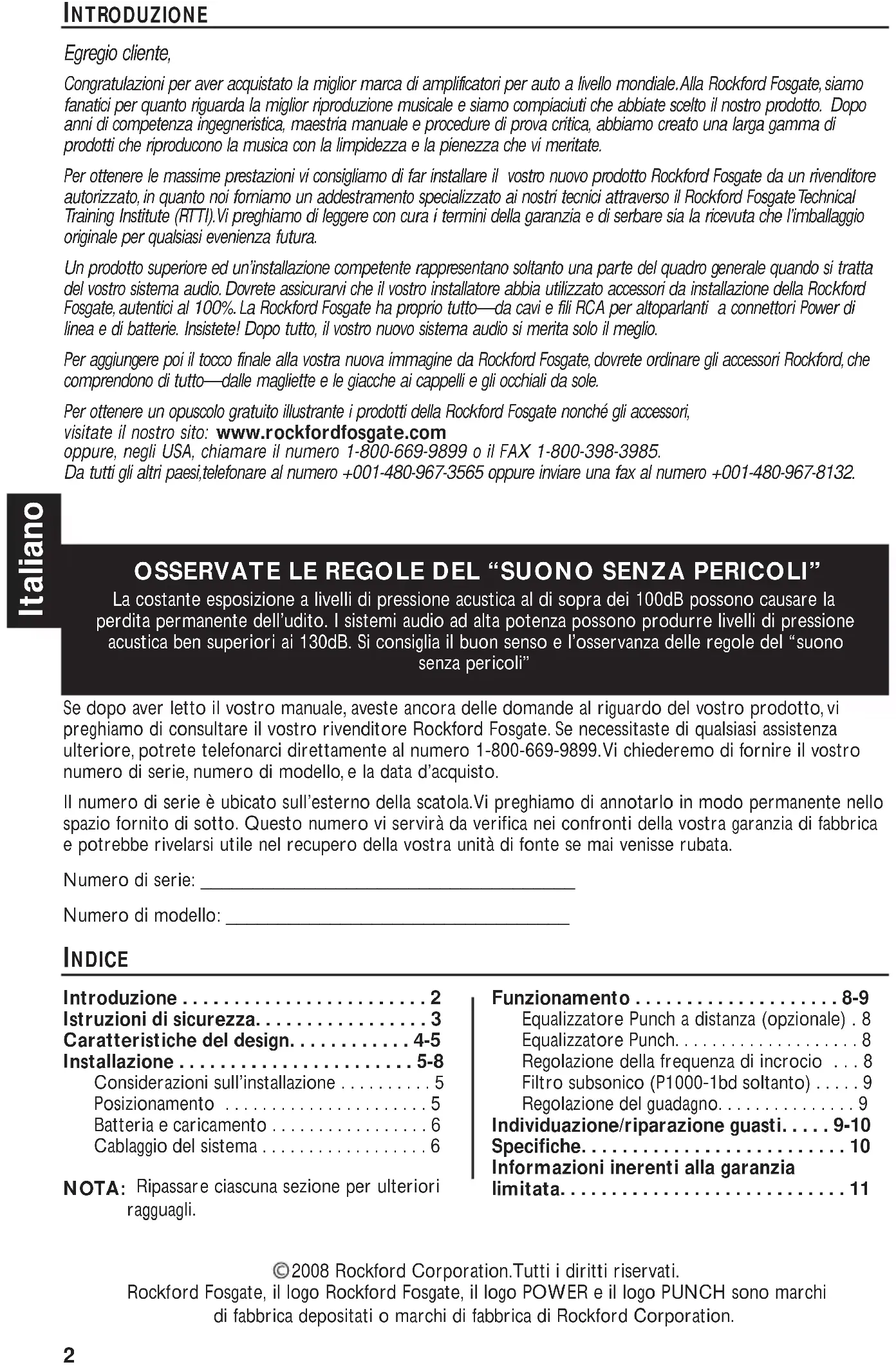 - Informazioni inerenti alla garanzia limitata 2008 Rockf ord Corporation.Tutti i diritti riservati. Rockf ord Fosgate, il logo Rockford Fosgate, il logo POWER e il logo PUNCH sono marchi di fabbrica depositati o marchi di fabbrica di Rockford Corporation.3 p. 11
