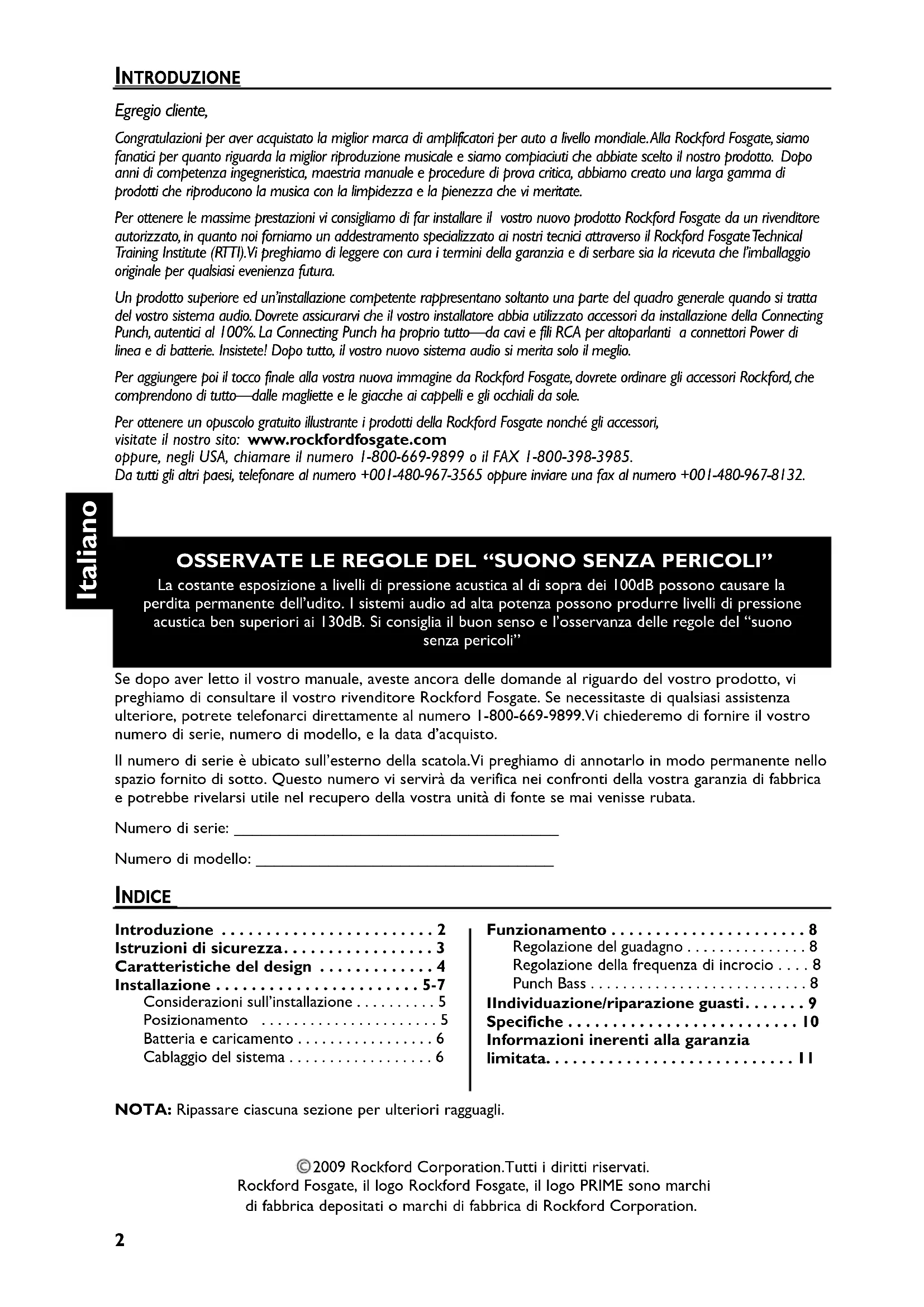 - Einschränkung von implizierten Garantien Implizierte Garantien, einschließlich von Garantien der Eignung für einen bestimmten Zweck und Marktgängigkeit, werden auf den Zeitraum der obenstehenden ausdrücklichen Garantie beschränkt. Manche Staaten erlauben Einschränkungen der Gültigkeit der implizierten Garantie nicht. Daher trifft diese Einschränkung nicht in allen Fällen zu. Inanspruchnahme des Kundendienstes Kontaktieren Sie bitte den Rockford Fosgate Vertragshändler, bei dem Sie dieses Produkt gekauft haben. Benötigen Sie zusätzliche Hilfe, rufen Sie den Kundendienst von Rockford unter 1-800-669-9899 an. Sie erhalten dann eine RA# (Rücksendungsautorisierungsnummer), um jegliche Produkte an Rockford Fosgate zurückzusenden. Sie sind für die Rücksendung des Produkts an Rockford verantwortlich. EU-Garantie Dieses Produkt entspricht den gültigen EU-Garantiebestimmungen. Sprechen Sie mit Ihrem Vertragshändler über die Einzelheiten.2 Italiano INTRODUZIONE INDICE Egregio cliente, Congratulazioni per aver acquistato la miglior marca di amplificatori per auto a livello mondiale.Alla Rockford Fosgate, siamo fanatici per quanto riguarda la miglior riproduzione musicale e siamo compiaciuti che abbiate scelto il nostro prodotto. Dopo anni di competenza ingegneristica, maestria manuale e procedure di prova critica, abbiamo creato una larga gamma di prodotti che riproducono la musica con la limpidezza e la pienezza che vi meritate. Per ottenere le massime prestazioni vi consigliamo di far installare il vostro nuovo prodotto Rockford Fosgate da un rivenditore autorizzato, in quanto noi forniamo un addestramento specializzato ai nostri tecnici attraverso il Rockford Fosgate Technical Training Institute (RTTI).Vi preghiamo di leggere con cura i termini della garanzia e di serbare sia la ricevuta che l’imballaggio originale per qualsiasi evenienza futura. Un prodotto superiore ed un’installazione competente rappresentano soltanto una parte del quadro generale quando si tratta del vostro sistema audio. Dovrete assicurarvi che il vostro installatore abbia utilizzato accessori da installazione della Connecting Punch, autentici al 100%. La Connecting Punch ha proprio tutto—da cavi e fili RCA per altoparlanti a connettori Power di linea e di batterie. Insistete! Dopo tutto, il vostro nuovo sistema audio si merita solo il meglio. Per aggiungere poi il tocco finale alla vostra nuova immagine da Rockford Fosgate, dovrete ordinare gli accessori Rockford, che comprendono di tutto—dalle magliette e le giacche ai cappelli e gli occhiali da sole. Per ottenere un opuscolo gratuito illustrante i prodotti della Rockford Fosgate nonché gli accessori, visitate il nostro sito: www.rockfordfosgate.com oppure, negli USA, chiamare il numero 1-800-669-9899 o il FAX 1-800-398-3985. Da tutti gli altri paesi, telefonare al numero +001-480-967-3565 oppure inviare una fax al numero +001-480-967-8132. OSSERVATE LE REGOLE DEL “SUONO SENZA PERICOLI” La costante esposizione a livelli di pressione acustica al di sopra dei 100dB possono causare la perdita permanente dell’udito. I sistemi audio ad alta potenza possono produrre livelli di pressione acustica ben superiori ai 130dB. Si consiglia il buon senso e l’osservanza delle regole del “suono senza pericoli” NOTA: Ripassare ciascuna sezione per ulteriori ragguagli. Se dopo aver letto il vostro manuale, aveste ancora delle domande al riguardo del vostro prodotto, vi preghiamo di consultare il vostro rivenditore Rockford Fosgate. Se necessitaste di qualsiasi assistenza ulteriore, potrete telefonarci direttamente al numero 1-800-669-9899.Vi chiederemo di fornire il vostro numero di serie, numero di modello, e la data d’acquisto. Il numero di serie è ubicato sull’esterno della scatola.Vi preghiamo di annotarlo in modo permanente nello spazio fornito di sotto. Questo numero vi servirà da verifica nei confronti della vostra garanzia di fabbrica e potrebbe rivelarsi utile nel recupero della vostra unità di fonte se mai venisse rubata. Numero di serie: ____________________________________ Numero di modello: _________________________________ Introduzione p. 2