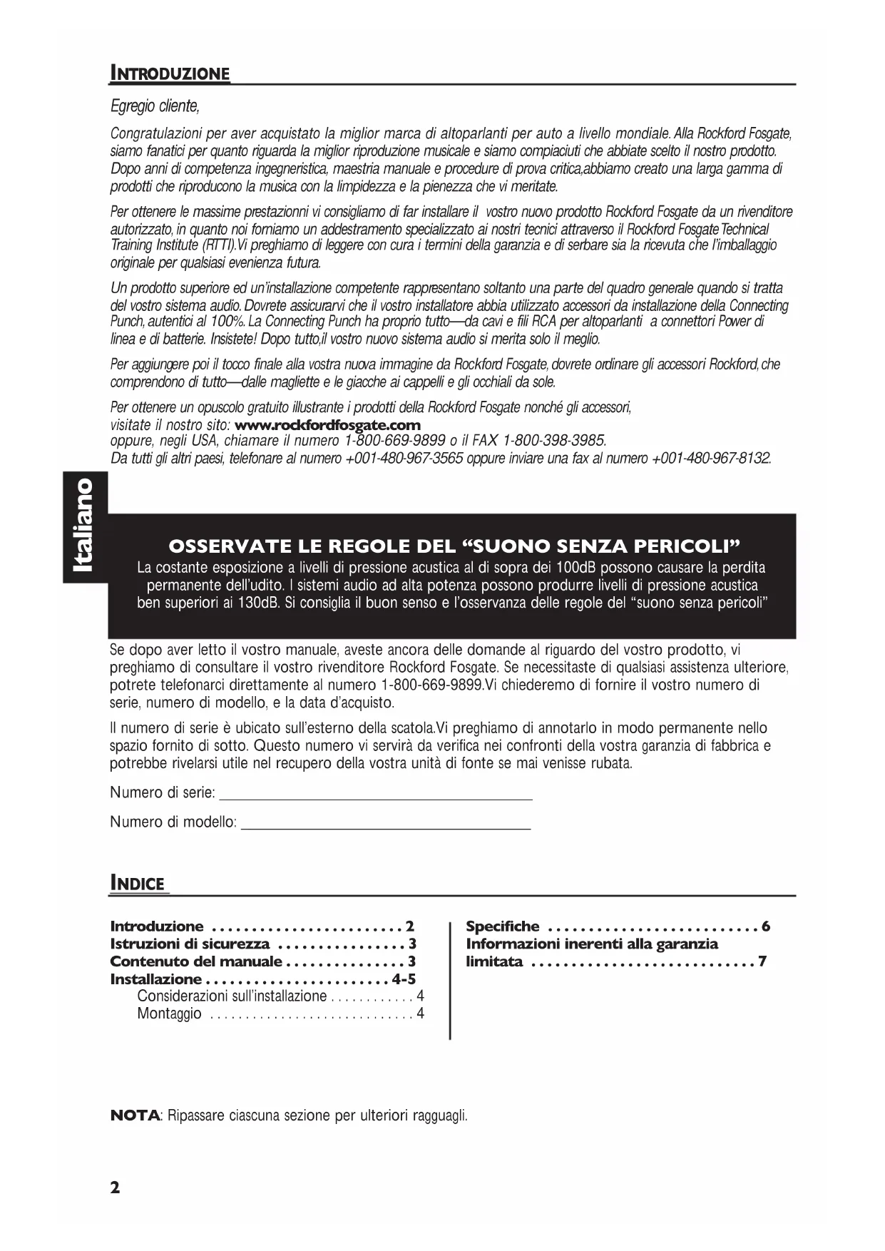 - INTR ODUZIONE INDICE Egregio cliente, Congratulazioni per aver acquistato la miglior marca di altoparlanti per auto a livello mondiale.Alla Rockford Fosgate, siamo fanatici per quanto riguarda la miglior riproduzione musicale e siamo compiaciuti che abbiate scelto il nostro prodotto. Dopo anni di competenza ingegneristica, maestria manuale e procedure di prova critica,abbiamo creato una larga gamma di prodotti che riproducono la musica con la limpidezza e la pienezza che vi meritate. Per ottenere le massime prestazionni vi consigliamo di far installare il vostro nuovo prodotto Rockford Fosgate da un rivenditore autorizzato, in quanto noi forniamo un addestramento specializzato ai nostri tecnici attraverso il Rockford Fosgate Technical Training Institute (RTTI).Vi preghiamo di leggere con cura i termini della garanzia e di serbare sia la ricevuta che l’imballaggio originale per qualsiasi evenienza futura. Un prodotto superiore ed un’installazione competente rappresentano soltanto una parte del quadro generale quando si tratta del vostro sistema audio.Dovrete assicurarvi che il vostro installatore abbia utilizzato accessori da installazione della Connecting Punch, autentici al 100%. La Connecting Punch ha proprio tutto—da cavi e fili RCA per altoparlanti a connettori Power di linea e di batterie. Insistete! Dopo tutto,il vostro nuovo sistema audio si merita solo il meglio. Per aggiungere poi il tocco finale alla vostra nuova immagine da Rockford Fosgate, dovrete ordinare gli accessori Rockford,che comprendono di tutto—dalle magliette e le giacche ai cappelli e gli occhiali da sole. Per ottenere un opuscolo gratuito illustrante i prodotti della Rockford Fosgate nonché gli accessori, visitate il nostro sito: www.rockfordfosgate.com oppure, negli USA, chiamare il numero 1-800-669-9899 o il FAX 1-800-398-3985. Da tutti gli altri paesi, telefonare al numero +001-480-967-3565 oppure inviare una fax al numero +001-480-967-8132. OSSERVATE LE REGOLE DEL “SUONO SENZA PERICOLI” La costante esposizione a livelli di pressione acustica al di sopra dei 100dB possono causare la perdita permanente dell’udito. I sistemi audio ad alta potenza possono produrre livelli di pressione acustica ben superiori ai 130dB. Si consiglia il buon senso e l’osservanza delle regole del “suono senza pericoli” NOTA: Ripassare ciascuna sezione per ulteriori ragguagli. Se dopo aver letto il vostro manuale, aveste ancora delle domande al riguardo del vostro prodotto, vi preghiamo di consultare il vostro rivenditore Rockford Fosgate. Se necessitaste di qualsiasi assistenza ulteriore, potrete telefonarci direttamente al numero 1-800-669-9899.Vi chiederemo di fornire il vostro numero di serie, numero di modello, e la data d’acquisto. Il numero di serie è ubicato sull’esterno della scatola.Vi preghiamo di annotarlo in modo permanente nello spazio fornito di sotto. Questo numero vi servirà da verifica nei confronti della vostra garanzia di fabbrica e potrebbe rivelarsi utile nel recupero della vostra unità di fonte se mai venisse rubata. Numero di serie: ________________________________________ Numero di modello: _____________________________________ Introduzione p. 2