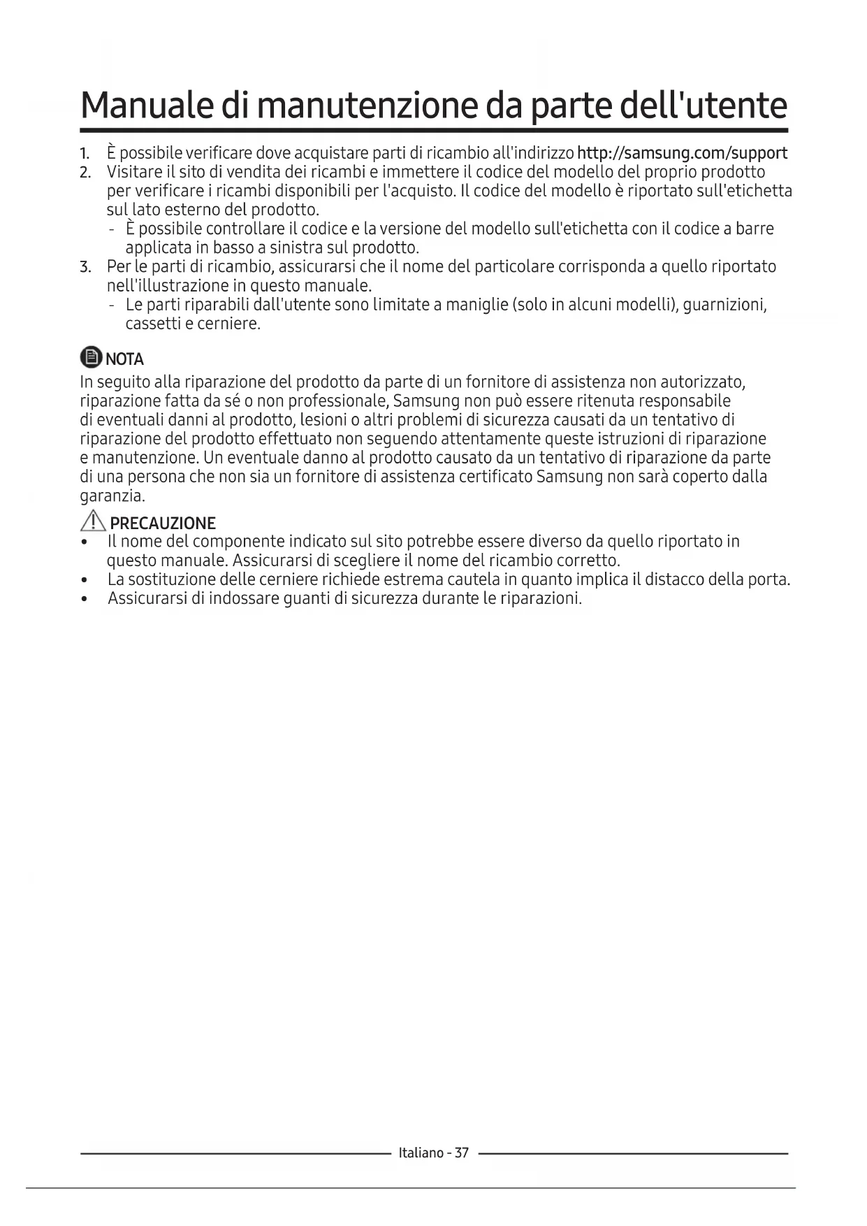 nell'illustrazione in questo manuale. ‐ Le parti riparabili dall'utente sono limitate a maniglie (solo in alcuni modelli), guarnizioni, cassetti e cerniere. NOTA In seguito alla riparazione del prodotto da parte di un fornitore di assistenza non autorizzato, riparazione fatta da sé o non professionale, Samsung non può essere ritenuta responsabile di eventuali danni al prodotto, lesioni o altri problemi di sicurezza causati da un tentativo di riparazione del prodotto effettuato non seguendo attentamente queste istruzioni di riparazione e manutenzione. Un eventuale danno al prodotto causato da un tentativo di riparazione da parte di una persona che non sia un fornitore di assistenza certificato Samsung non sarà coperto dalla garanzia. PRECAUZIONE