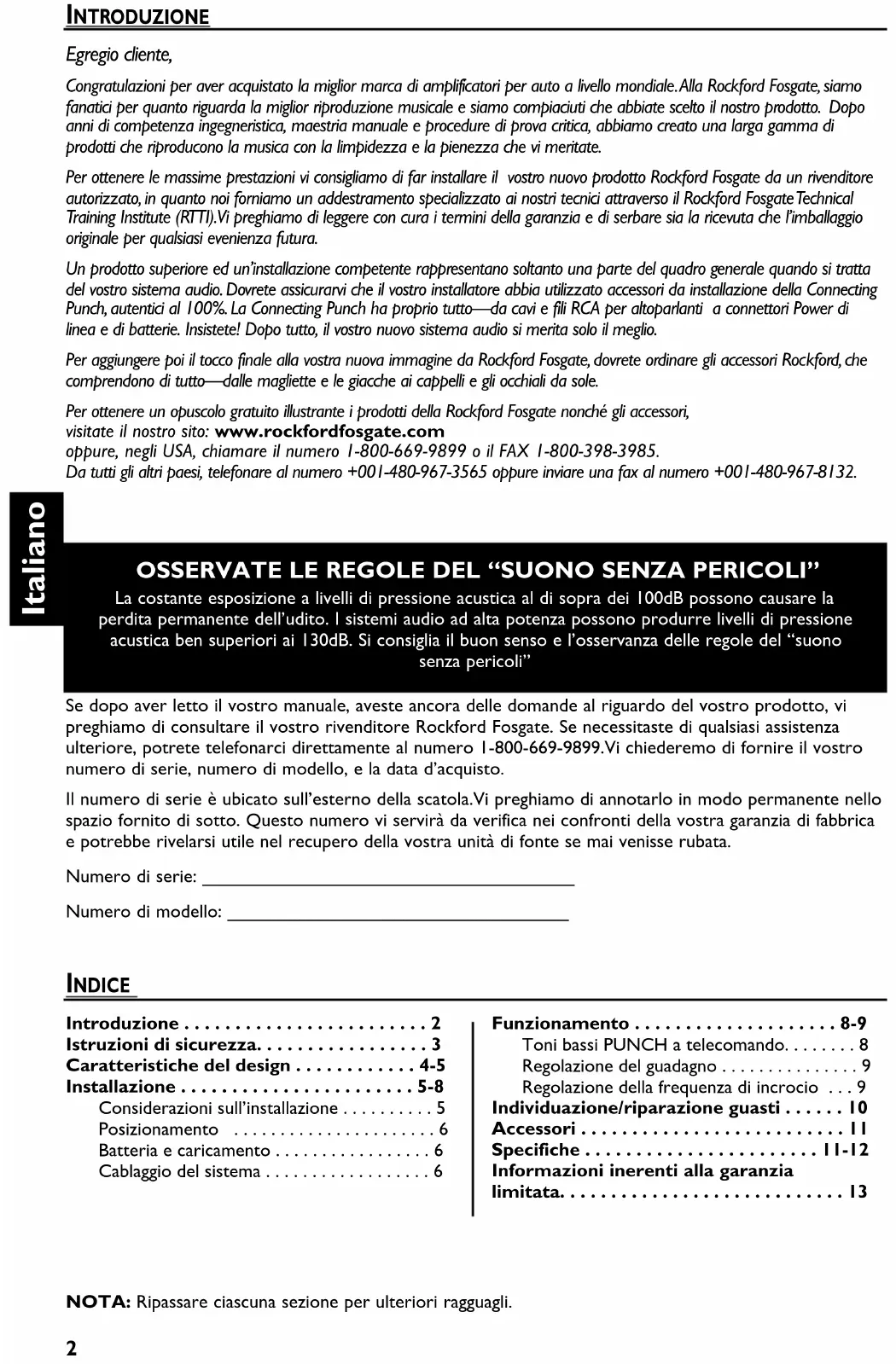 - Einschränkung von implizierten Garantien Implizierte Garantien, einschließlich von Garantien der Eignung für einen bestimmten Zweck und Marktgängigkeit, werden auf den Zeitraum der obenstehenden ausdrücklichen Garantie beschränkt. Manche Staaten erlauben Einschränkungen der Gültigkeit der implizierten Garantie nicht. Daher trifft diese Einschränkung nicht in allen Fällen zu. Inanspruchnahme des Kundendienstes Kontaktieren Sie bitte den Rockford Fosgate Vertragshändler, bei dem Sie dieses Produkt gekauft haben. Benötigen Sie zusätzliche Hilfe, rufen Sie den Kundendienst von Rockford unter 1-800-669-9899 an. Sie erhalten dann eine RA# (Rücksendungsautorisierungsnummer), um jegliche Produkte an Rockford Fosgate zurückzusenden. Sie sind für die Rücksendung des Produkts an Rockford verantwortlich. EU-Garantie Dieses Produkt entspricht den gültigen EU-Garantiebestimmungen. Sprechen Sie mit Ihrem Vertragshändler über die Einzelheiten.2 Italiano INTR ODUZIONE INDICE Egregio cliente, Congratulazioni per aver acquistato la miglior marca di amplificatori per auto a livello mondiale.Alla Rockford Fosgate, siamo fanatici per quanto riguarda la miglior riproduzione musicale e siamo compiaciuti che abbiate scelto il nostro prodotto. Dopo anni di competenza ingegneristica, maestria manuale e procedure di prova critica, abbiamo creato una larga gamma di prodotti che riproducono la musica con la limpidezza e la pienezza che vi meritate. Per ottenere le massime prestazioni vi consigliamo di far installare il vostro nuovo prodotto Rockford Fosgate da un rivenditore autorizzato, in quanto noi forniamo un addestramento specializzato ai nostri tecnici attraverso il Rockford Fosgate Technical Training Institute (RTTI).Vi preghiamo di leggere con cura i termini della garanzia e di serbare sia la ricevuta che l’imballaggio originale per qualsiasi evenienza futura. Un prodotto superiore ed un’installazione competente rappresentano soltanto una parte del quadro generale quando si tratta del vostro sistema audio. Dovrete assicurarvi che il vostro installatore abbia utilizzato accessori da installazione della Connecting Punch, autentici al 100%. La Connecting Punch ha proprio tutto—da cavi e fili RCA per altoparlanti a connettori Power di linea e di batterie. Insistete! Dopo tutto, il vostro nuovo sistema audio si merita solo il meglio. Per aggiungere poi il tocco finale alla vostra nuova immagine da Rockford Fosgate, dovrete ordinare gli accessori Rockford, che comprendono di tutto—dalle magliette e le giacche ai cappelli e gli occhiali da sole. Per ottenere un opuscolo gratuito illustrante i prodotti della Rockford Fosgate nonché gli accessori, visitate il nostro sito: www.rockfordfosgate.com oppure, negli USA, chiamare il numero 1-800-669-9899 o il FAX 1-800-398-3985. Da tutti gli altri paesi, telefonare al numero +001-480-967-3565 oppure inviare una fax al numero +001-480-967-8132. OSSERVATE LE REGOLE DEL “SUONO SENZA PERICOLI” La costante esposizione a livelli di pressione acustica al di sopra dei 100dB possono causare la perdita permanente dell’udito. I sistemi audio ad alta potenza possono produrre livelli di pressione acustica ben superiori ai 130dB. Si consiglia il buon senso e l’osservanza delle regole del “suono senza pericoli” NOTA: Ripassare ciascuna sezione per ulteriori ragguagli. Se dopo aver letto il vostro manuale, aveste ancora delle domande al riguardo del vostro prodotto, vi preghiamo di consultare il vostro rivenditore Rockford Fosgate. Se necessitaste di qualsiasi assistenza ulteriore, potrete telefonarci direttamente al numero 1-800-669-9899.Vi chiederemo di fornire il vostro numero di serie, numero di modello, e la data d’acquisto. Il numero di serie è ubicato sull’esterno della scatola.Vi preghiamo di annotarlo in modo permanente nello spazio fornito di sotto. Questo numero vi servirà da verifica nei confronti della vostra garanzia di fabbrica e potrebbe rivelarsi utile nel recupero della vostra unità di fonte se mai venisse rubata. Numero di serie: ____________________________________ Numero di modello: _________________________________ Introduzione p. 2